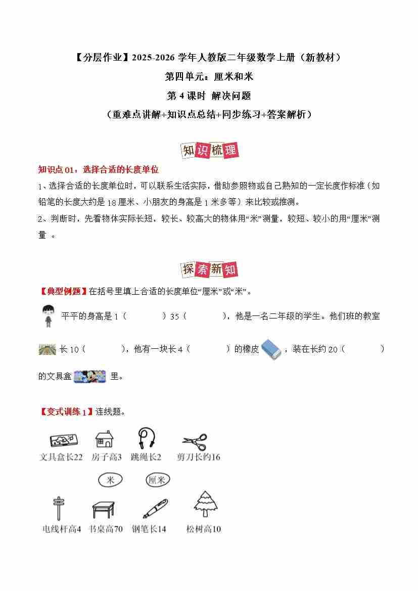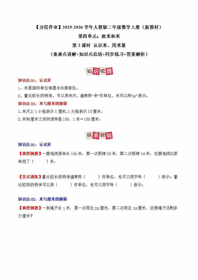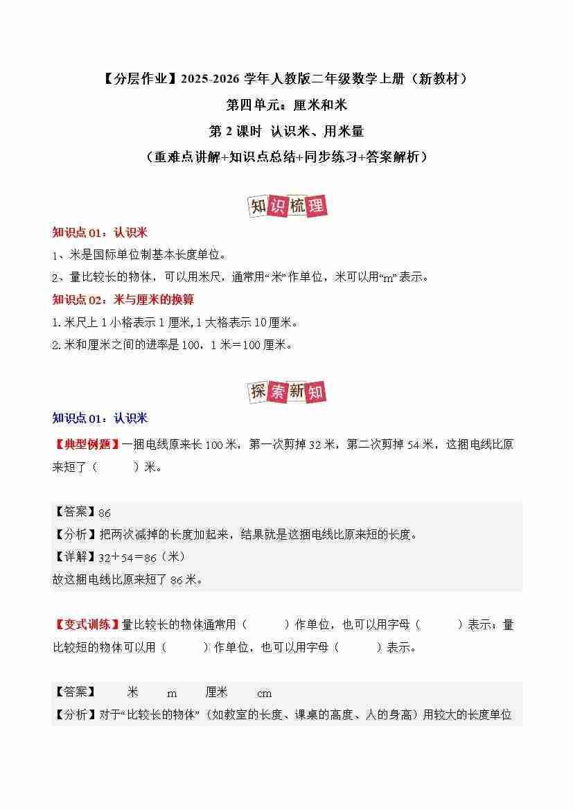 第四单元 第2课时 认识米、用米量 (分层作业)(解析版)