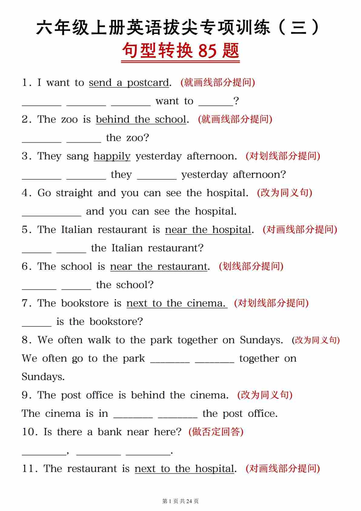 《六年级上册英语拔尖专项训练三句型转换85题》人教PEP版