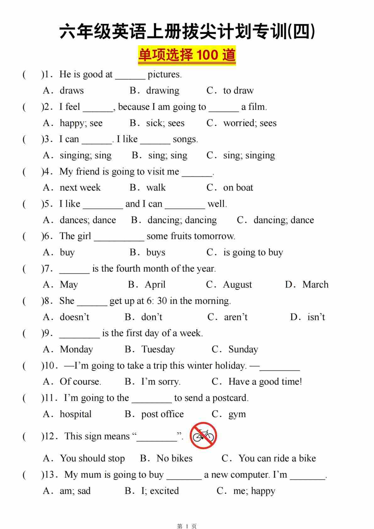 《六年级英语上册拔尖计划专训(四)单项选择100道》人教PEP版)