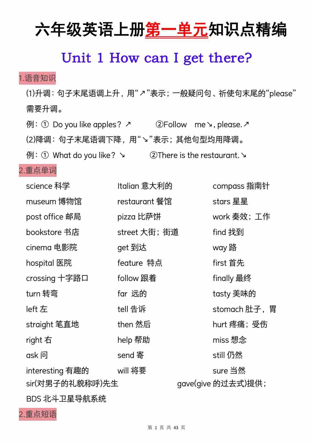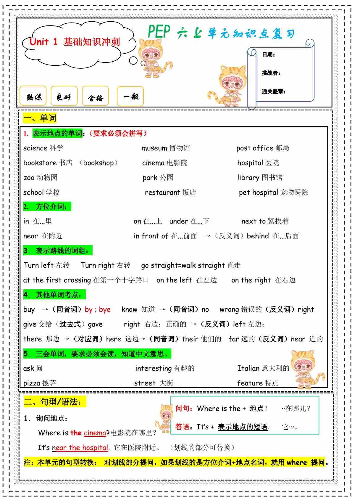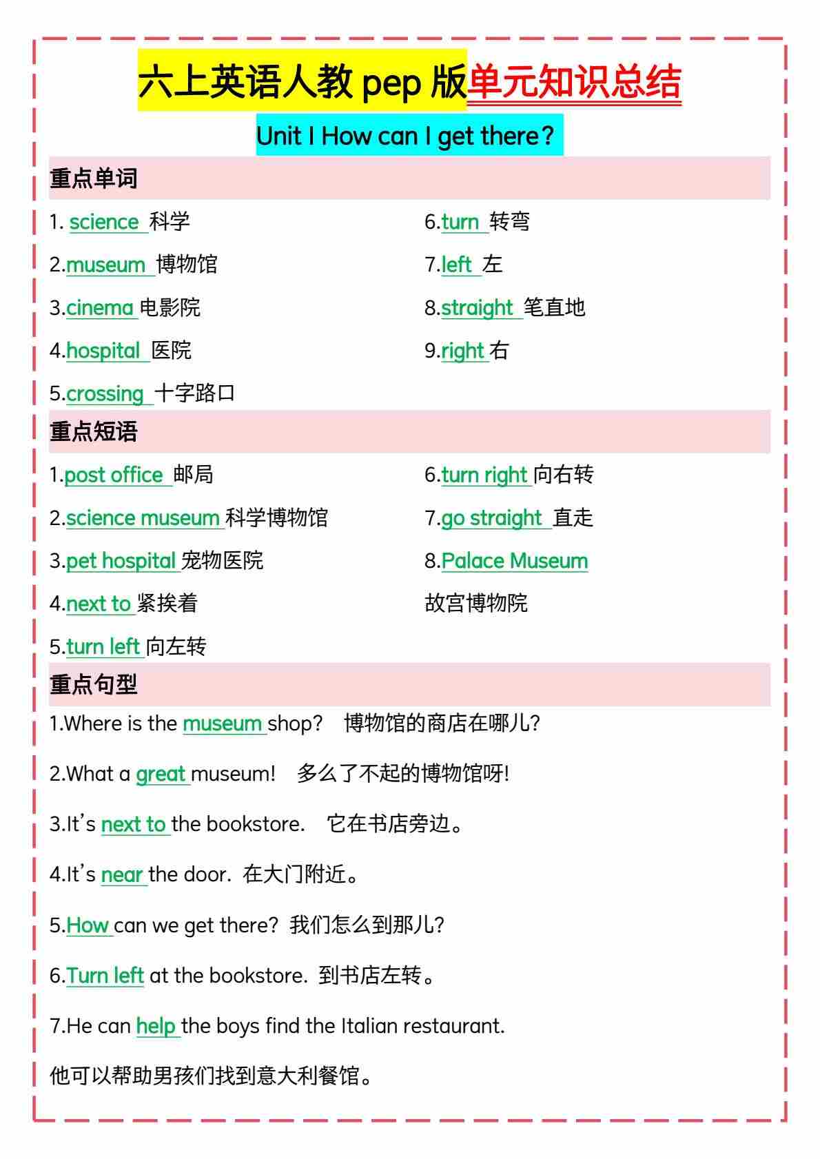 六上人教PEP版英语【1-6单元知识点精编】
