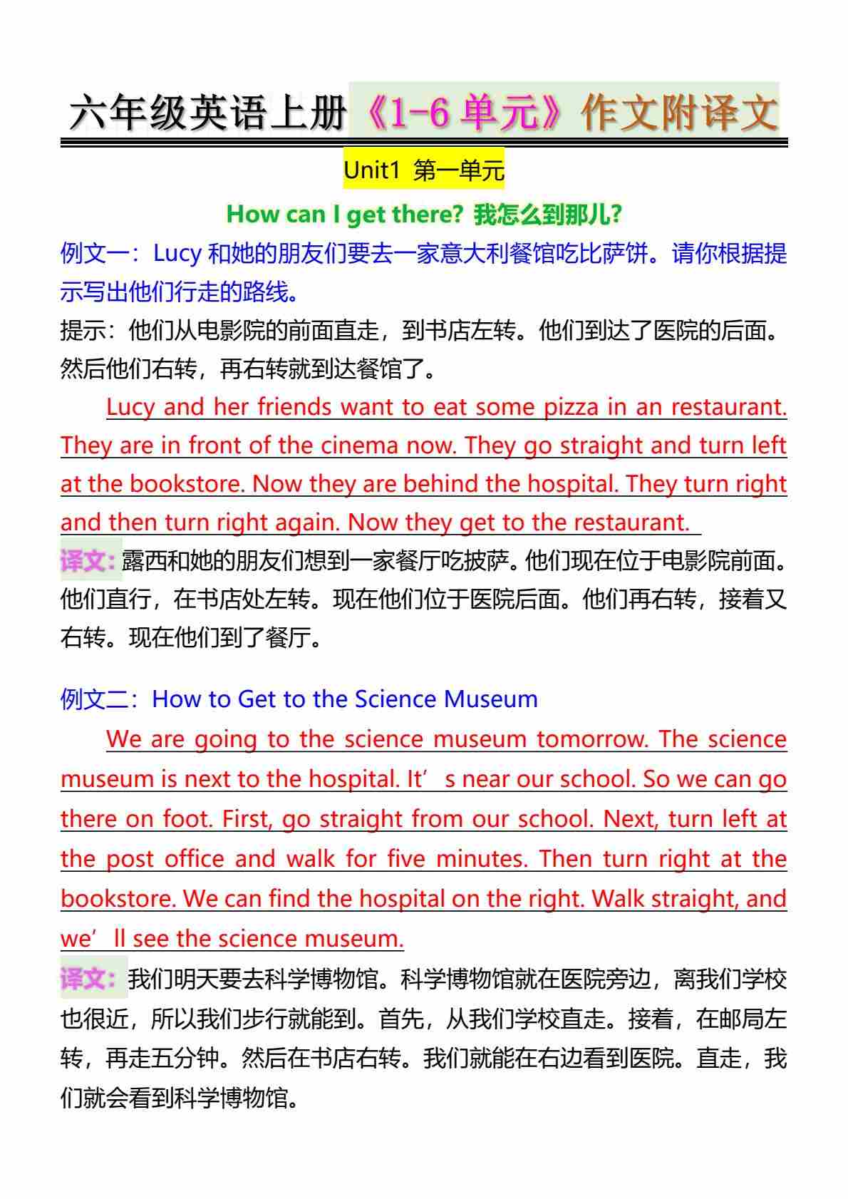 六上人教PEP版英语《1-6单元》作文附译文