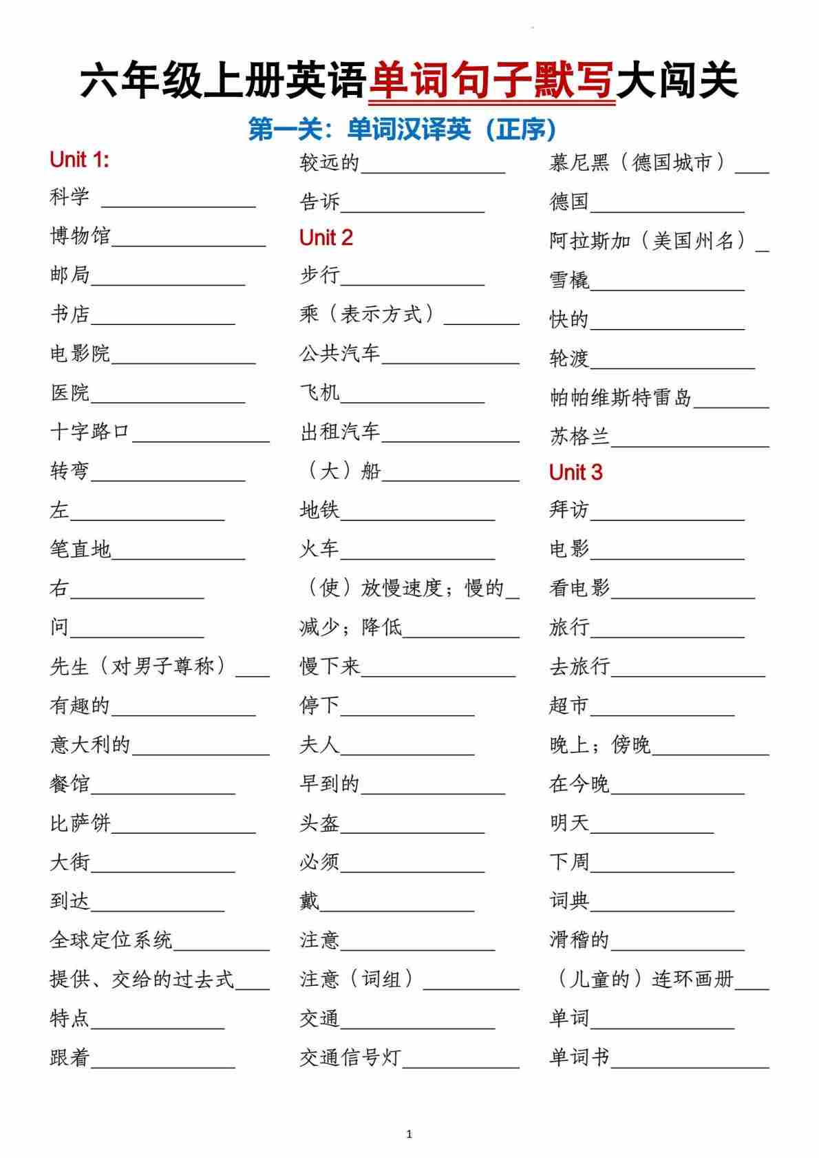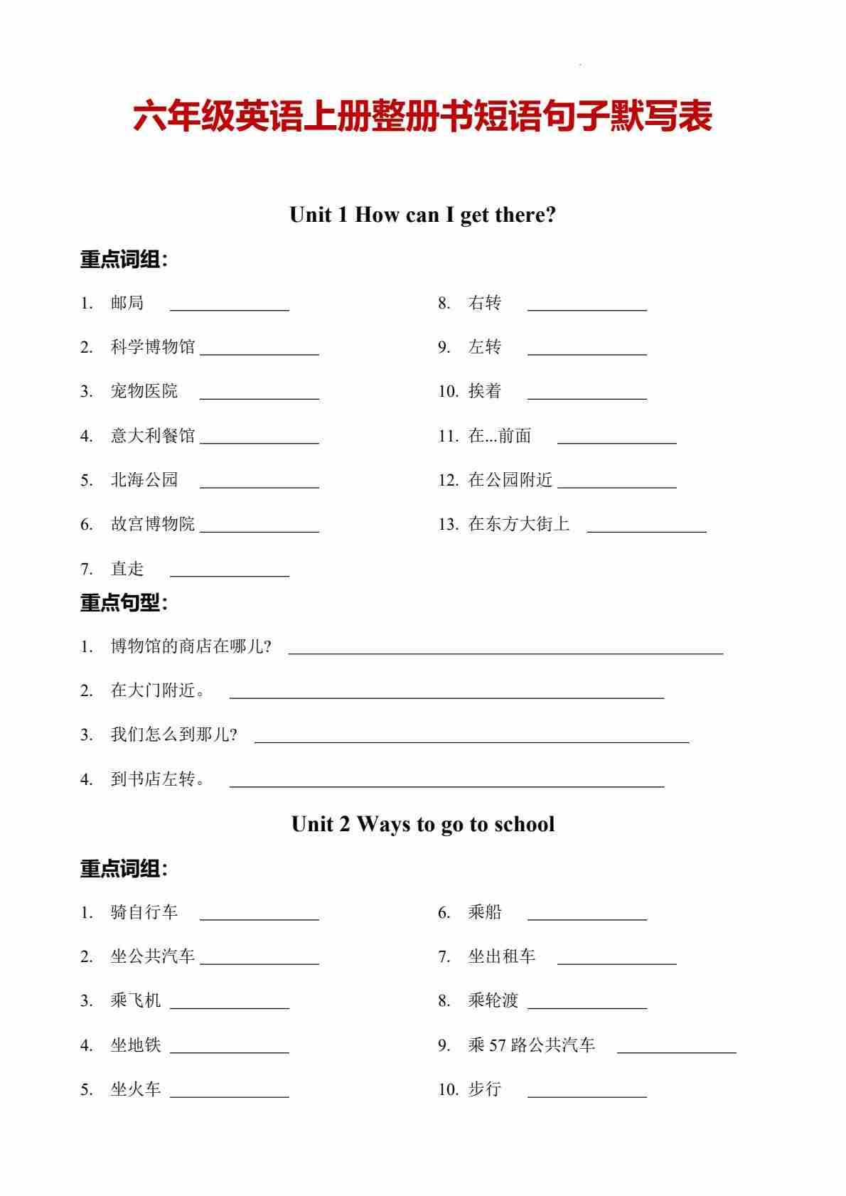 六年级英语上册整册书短语句子默写表(人教PEP版)