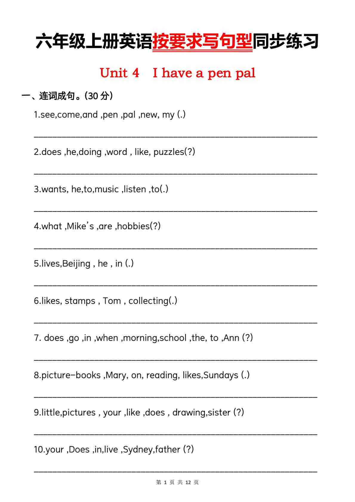 六上人教PEP版英语【按要求写句型同步练习】