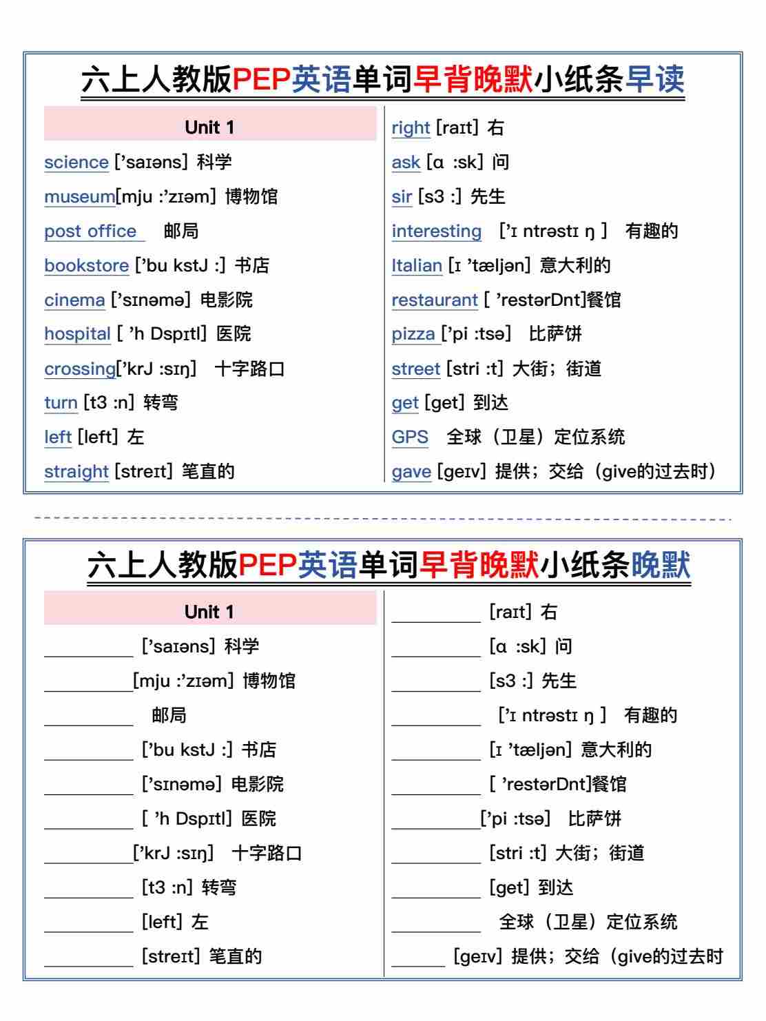 六上人教版PEP英语单词早背晚默小纸条