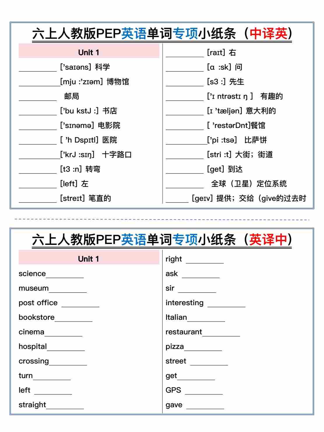 六上人教版英语整册单词单词专项小纸条