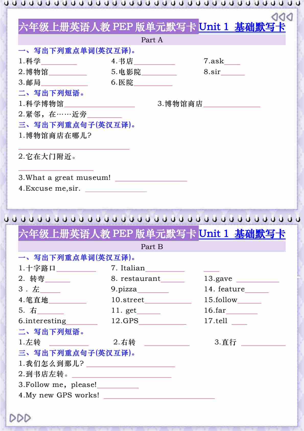 六年级上册英语人教PEP版单元默写卡