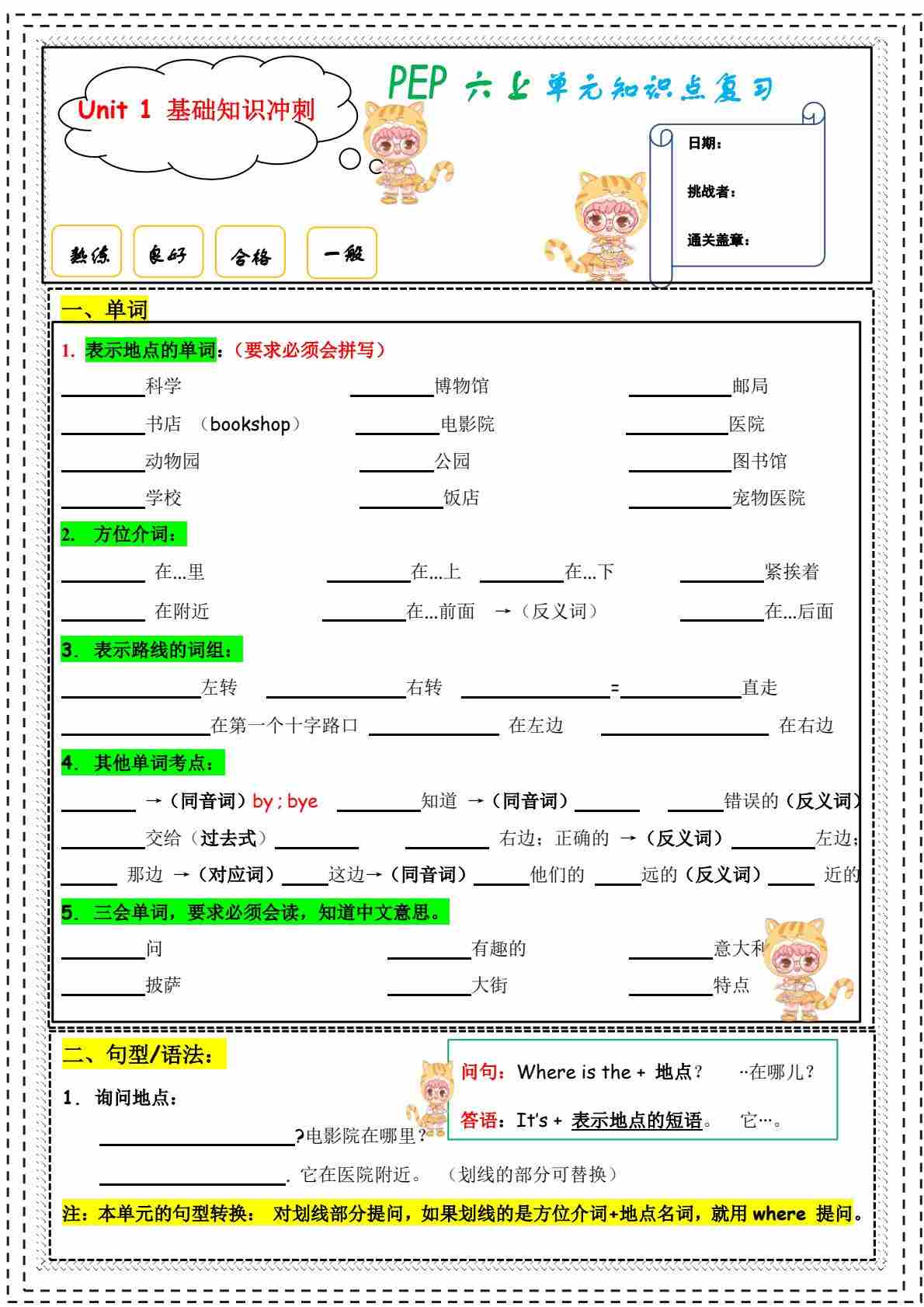 【默写版】人教pep版单元知识点冲刺复习-六年级英语上册U1-U6 18页
