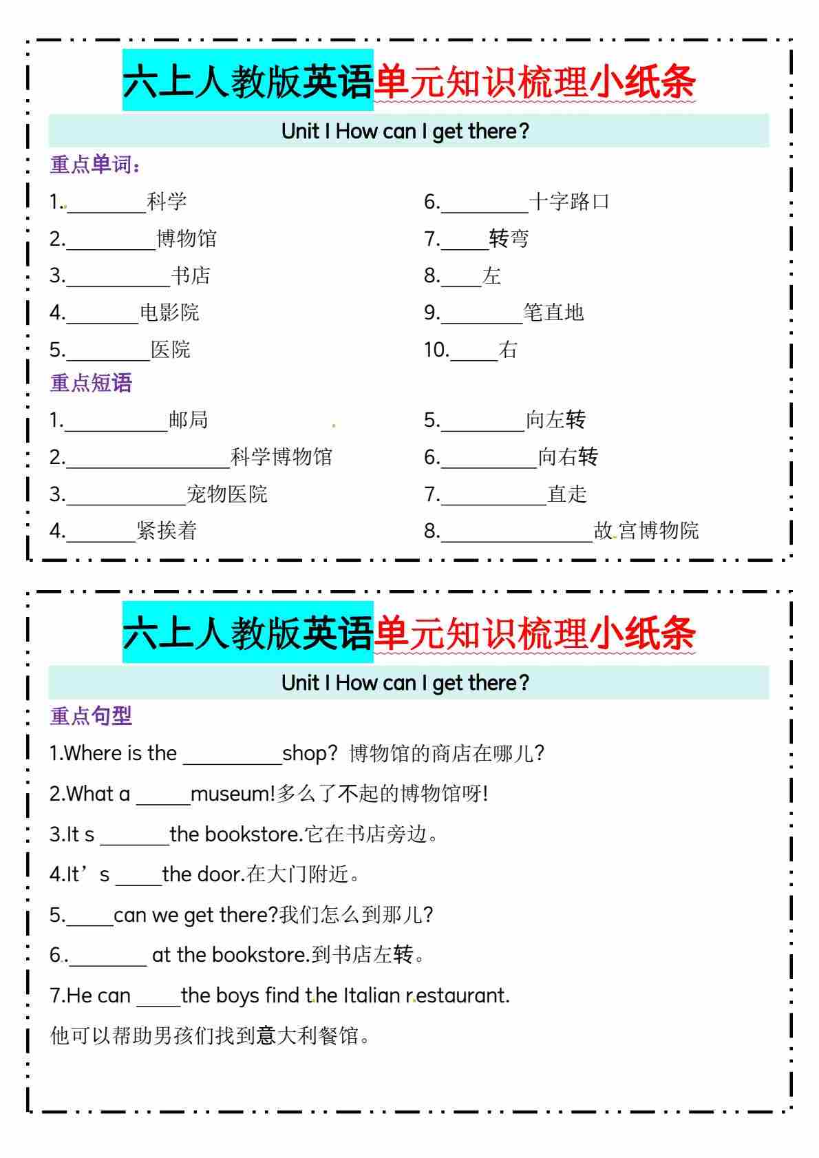 六上人教版pep英语单元知识梳理小纸条