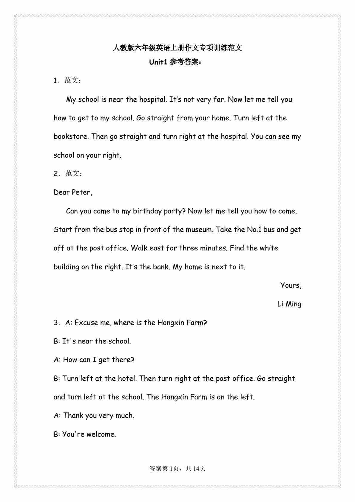 六上人教版书面表达每日一练小纸条【答案】
