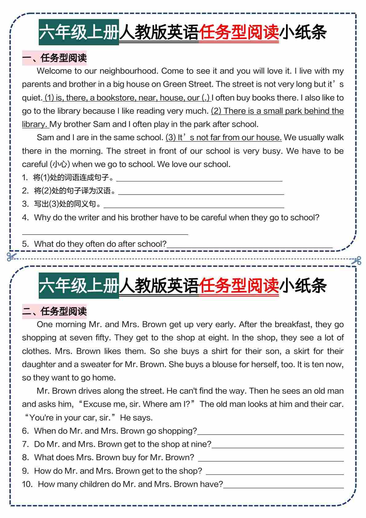 六上人教版任务型阅读每日一练小纸条