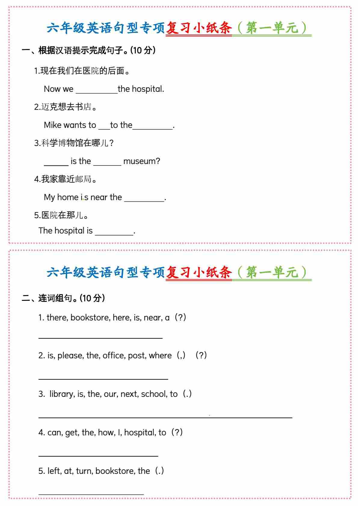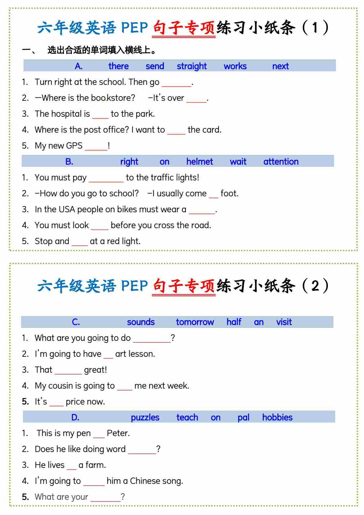 六上英语人教pep句子专项练习小纸条