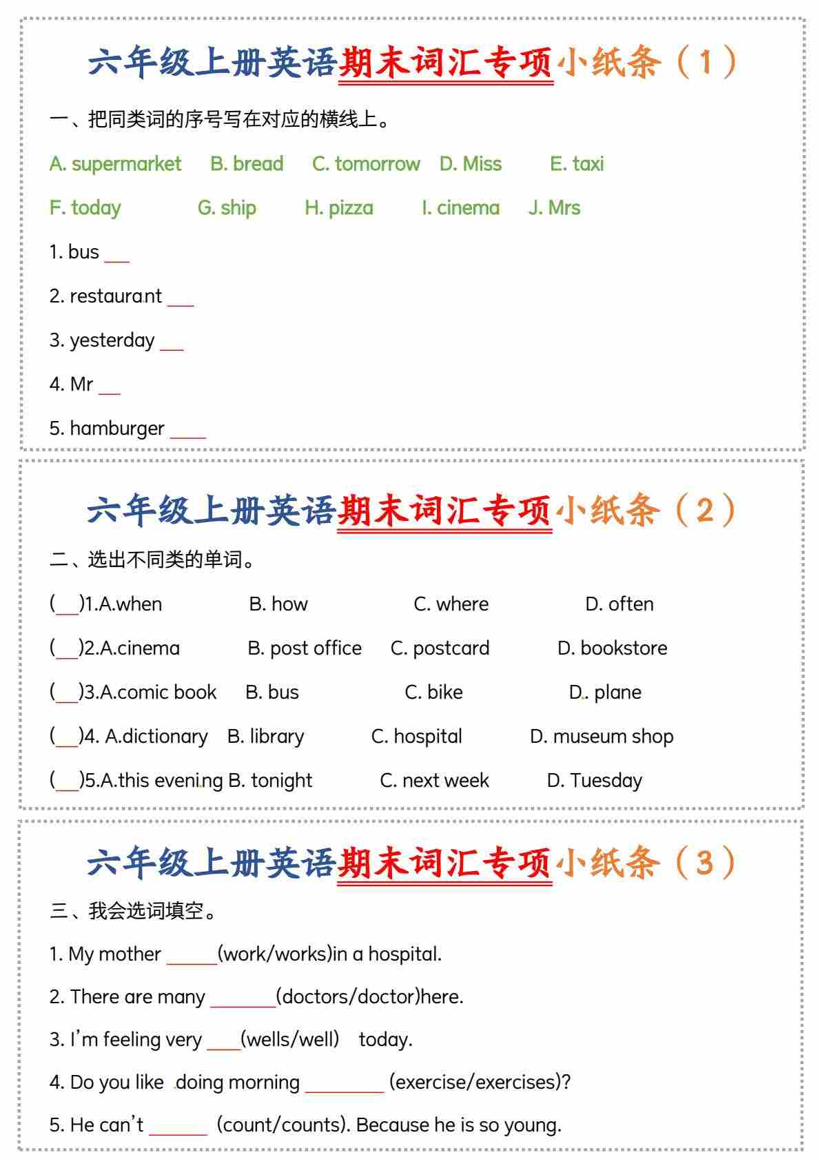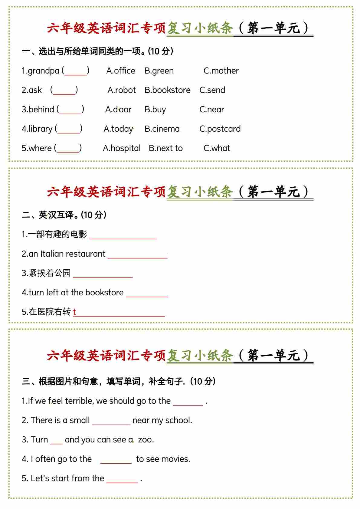 六上英语人教pep词汇专项复习小纸条U1-U3