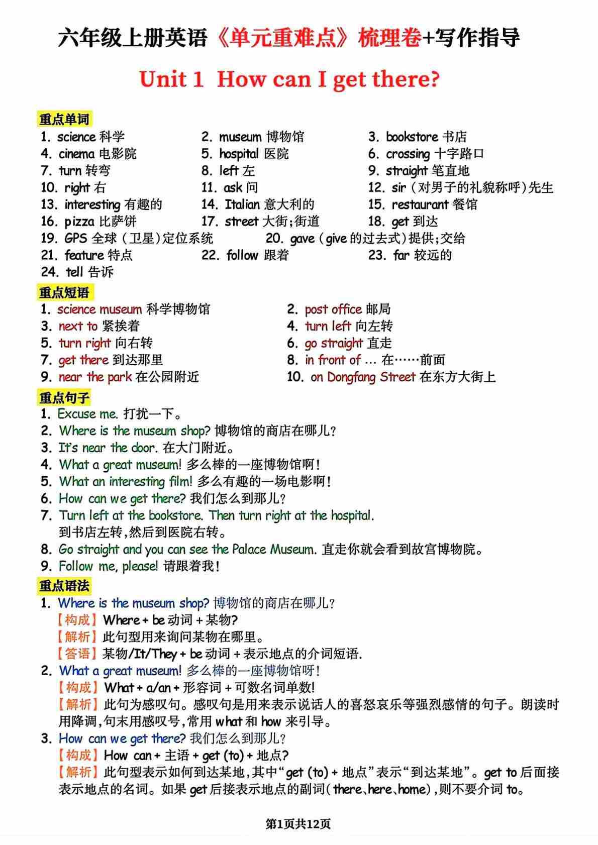 六年级上册人教版英语1-6单元必背重难点