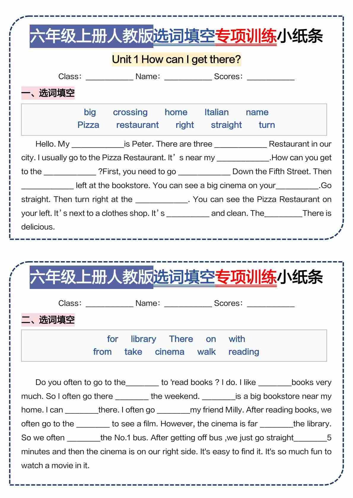 六年级上册人教版选词填空专项训练小纸条