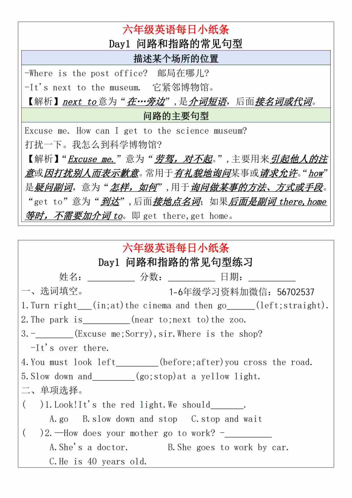六(上)英语(人教PEP)每日语法小纸条