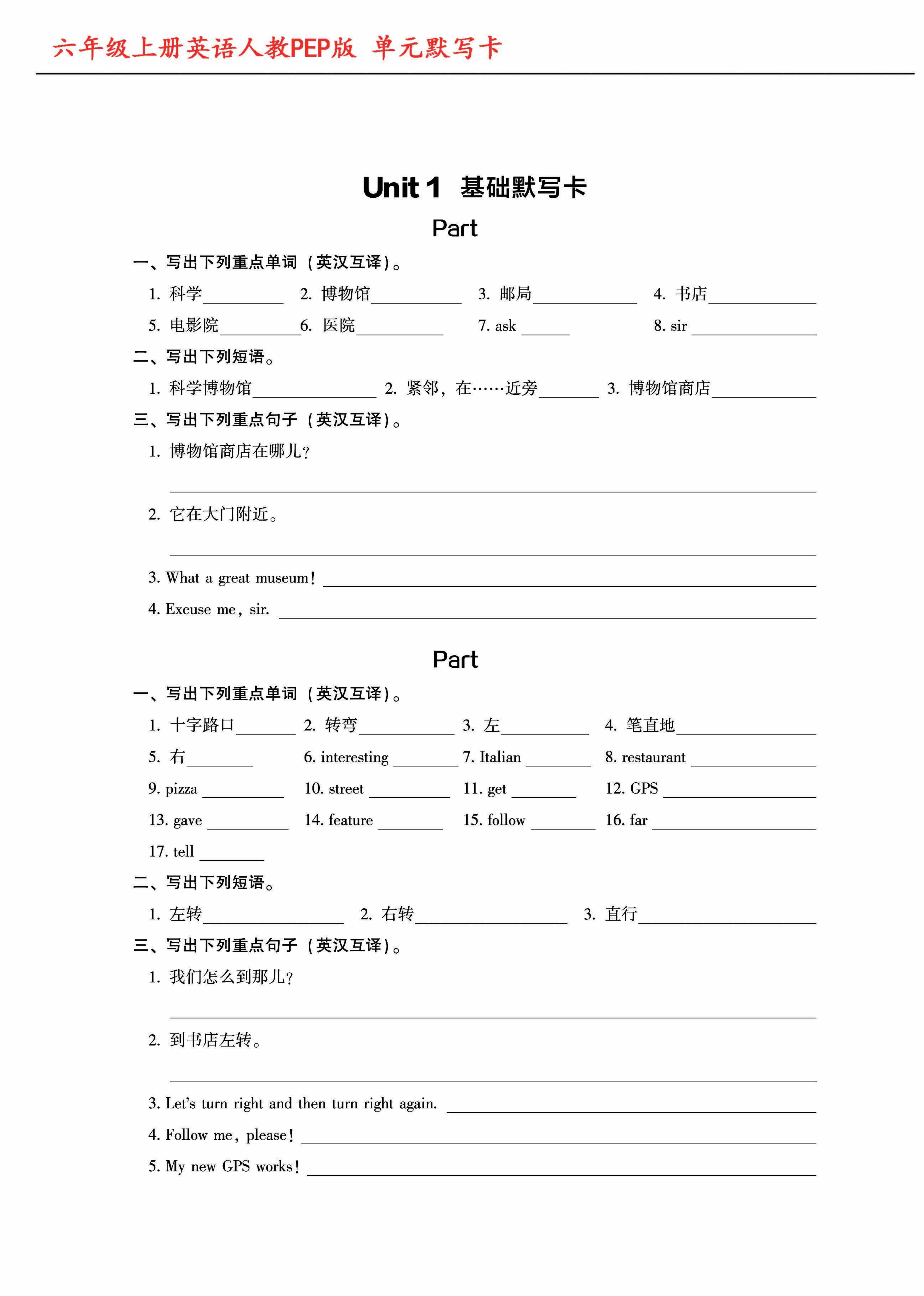 六(上)英语(人教PEP)英语基础默写卡