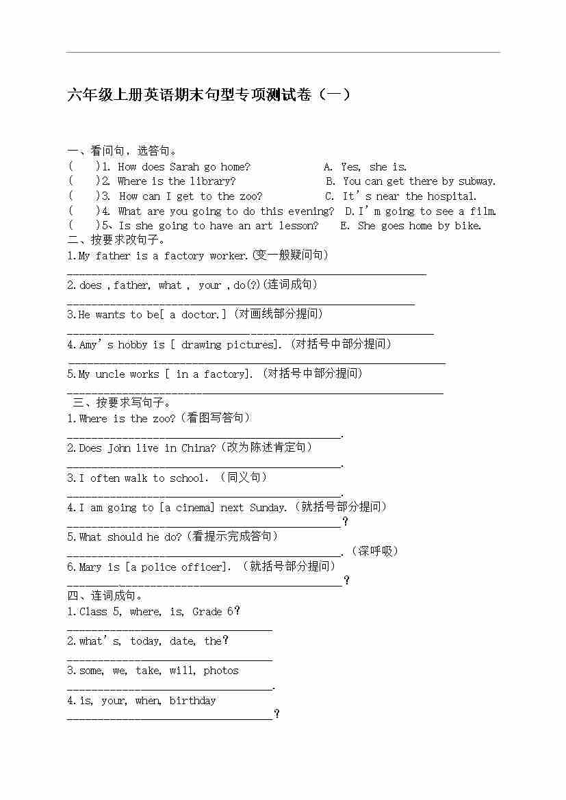 【句型专项】人教版PEP 六年上册英语期末句型专项测试卷(一)(含答案)