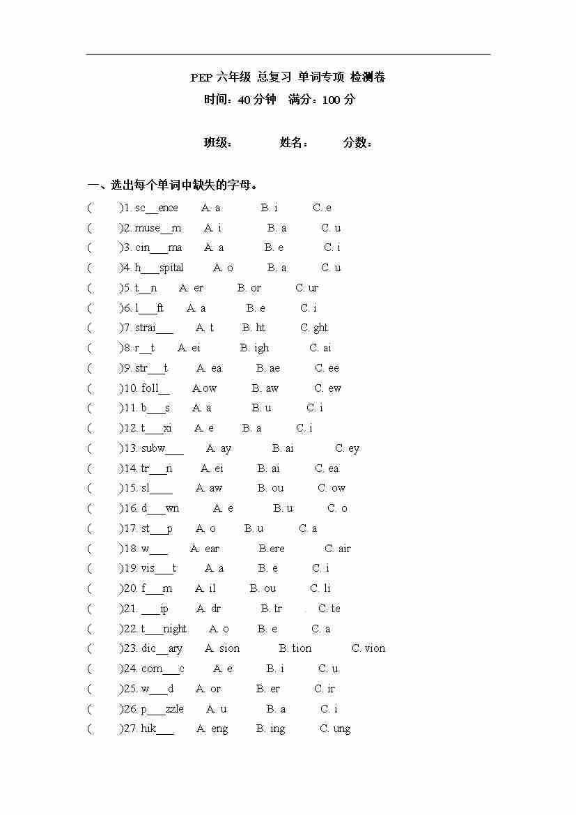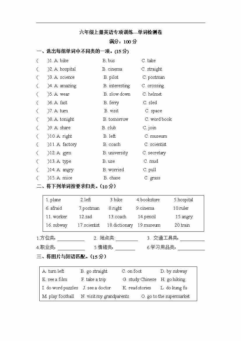 六年级上册英语期末专项卷-词汇 人教PEP(word版,含答案)