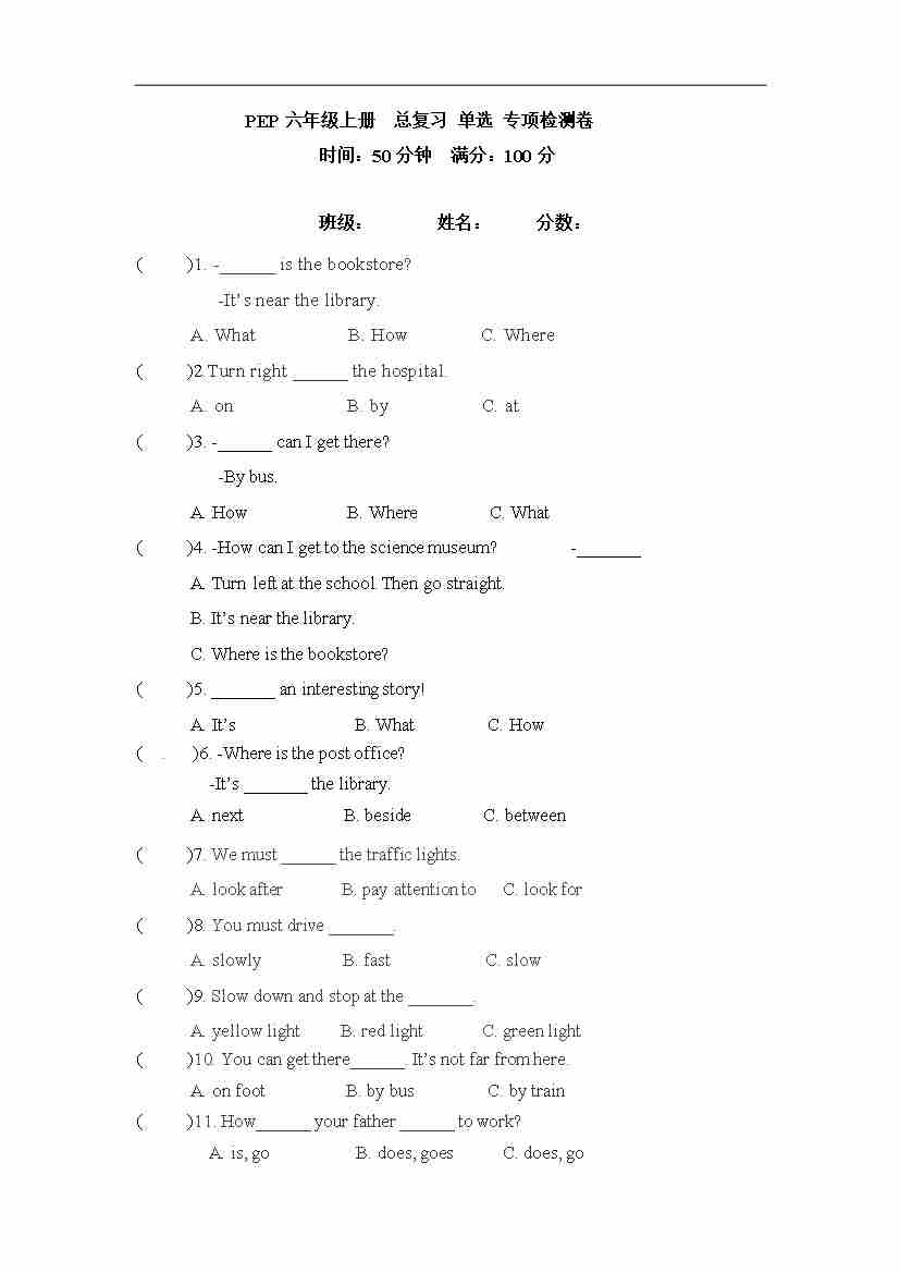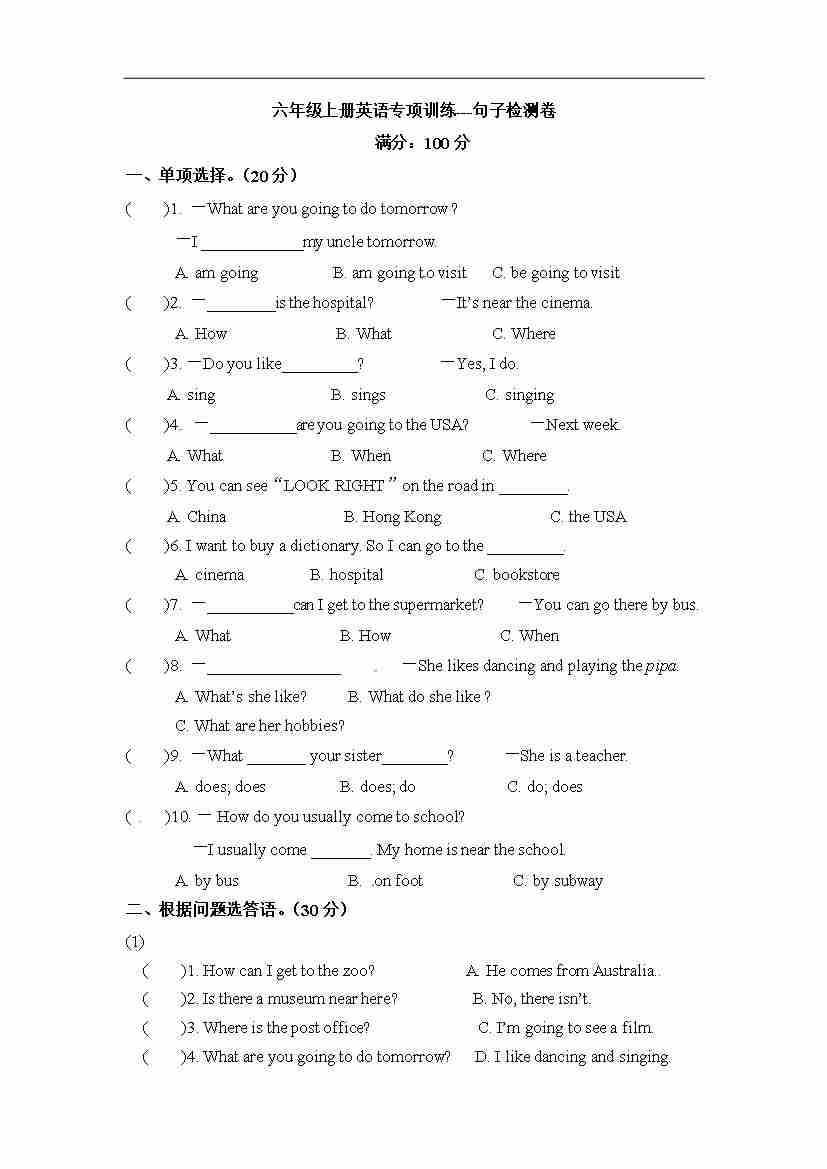 【期末突破】六年级上册英语期末专项卷-单选 人教PEP(word版,含答案)