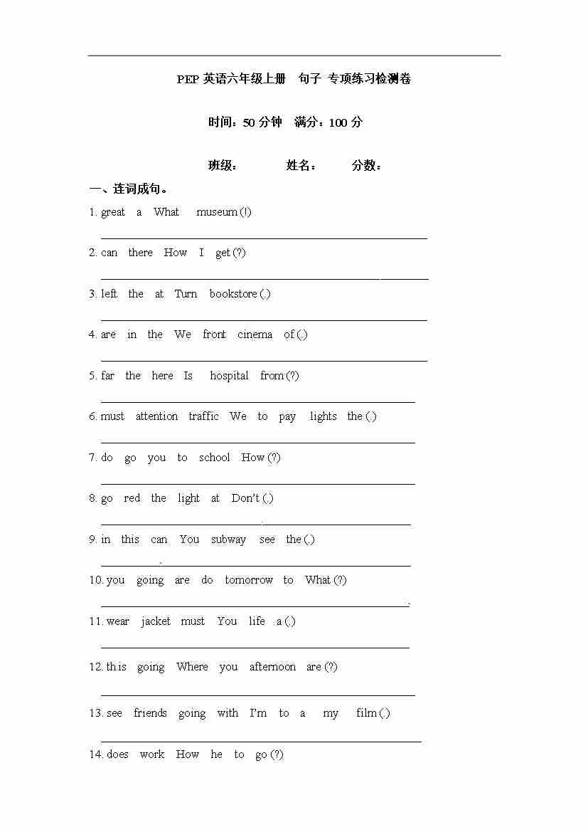 【期末】六年级上册英语专项训练---句子 人教PEP(word版,含答案)