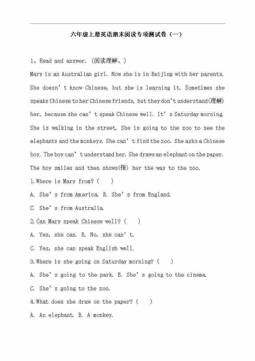 【阅读专项】人教版PEP 六年上册英语期末阅读专项测试卷(一)(含答案)