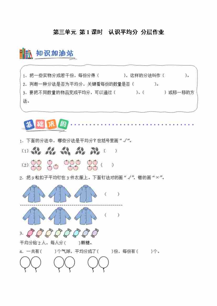 第三单元 第1课时 认识平均分(分层作业)数学青岛五四版二年级上册(新教材)