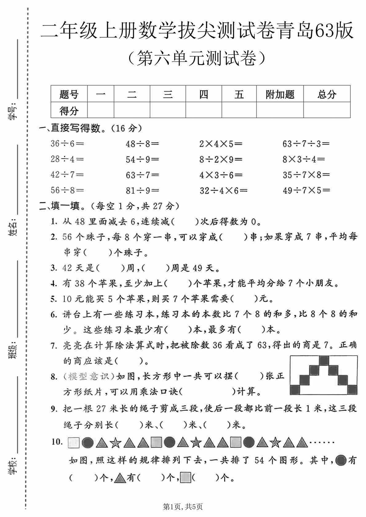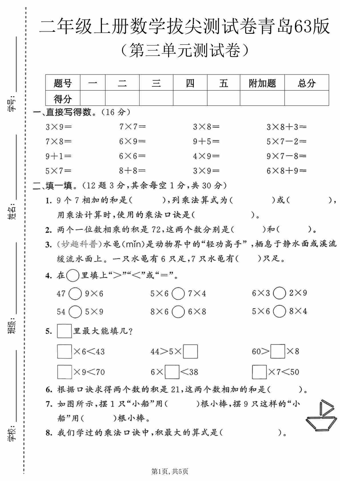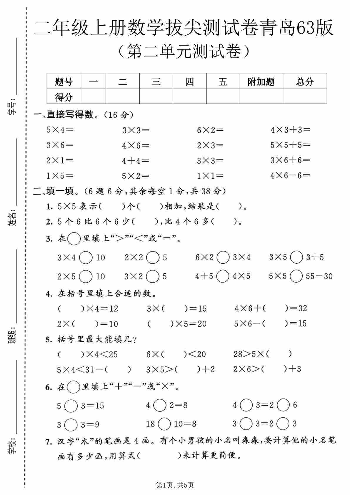 二年级(上)数学 第五单元拔尖测试卷 《青岛63版》