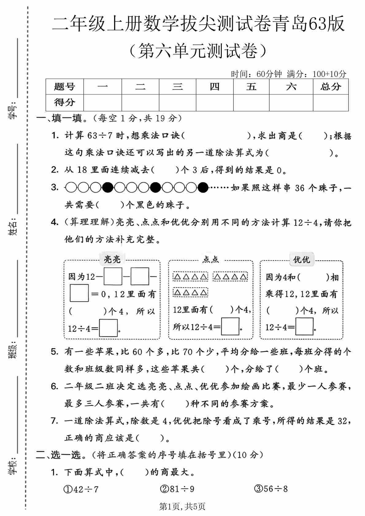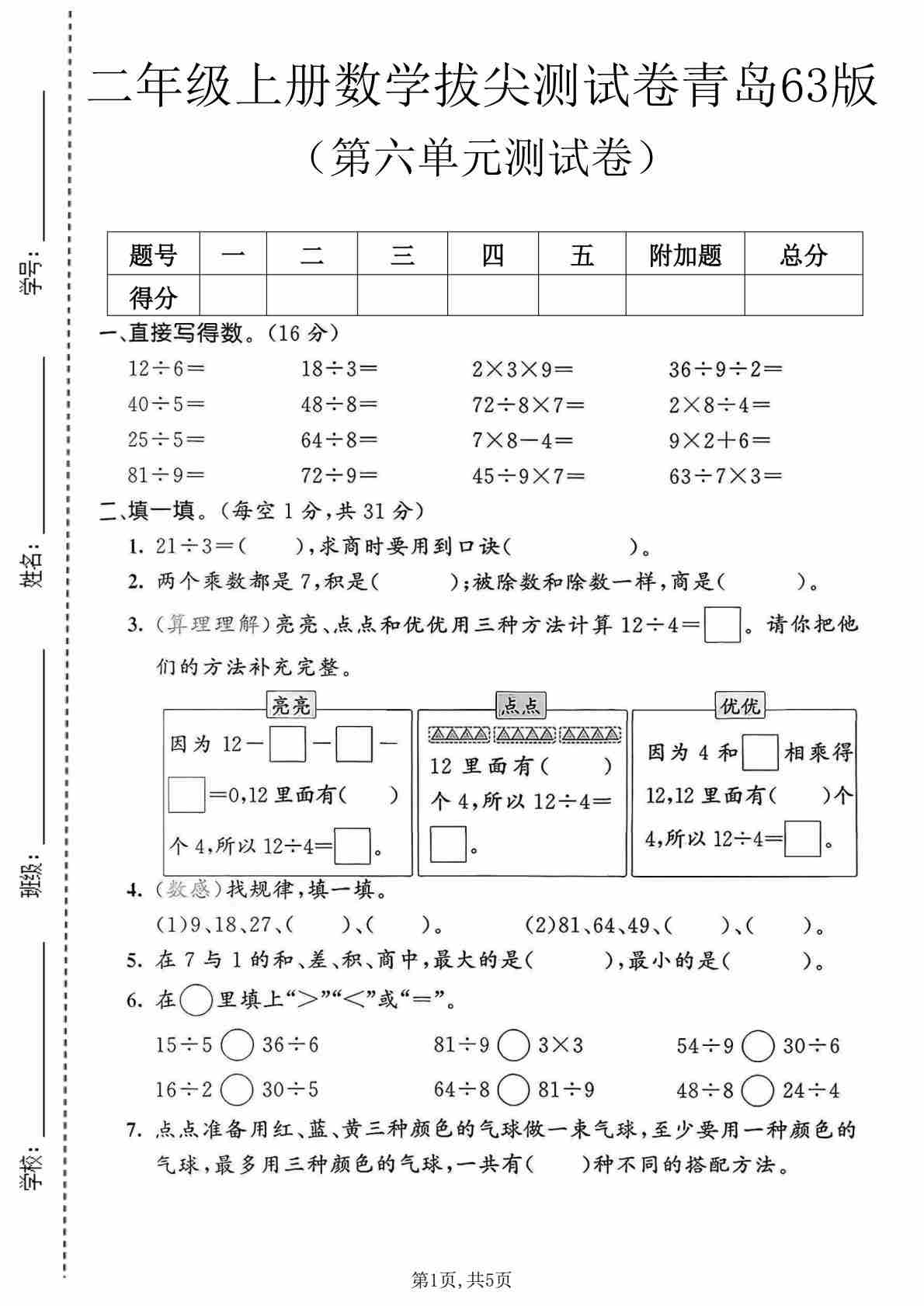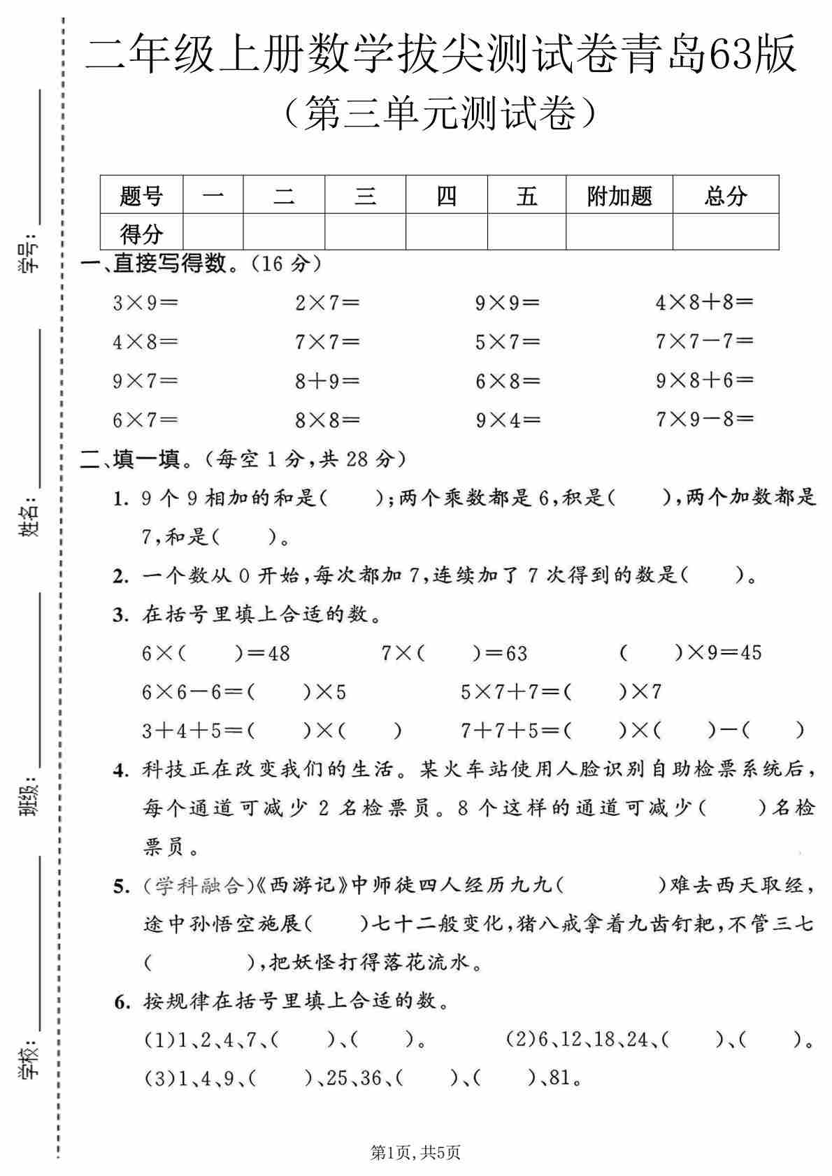 二年级(上)数学 第五单元拔尖测试卷 《青岛63版》