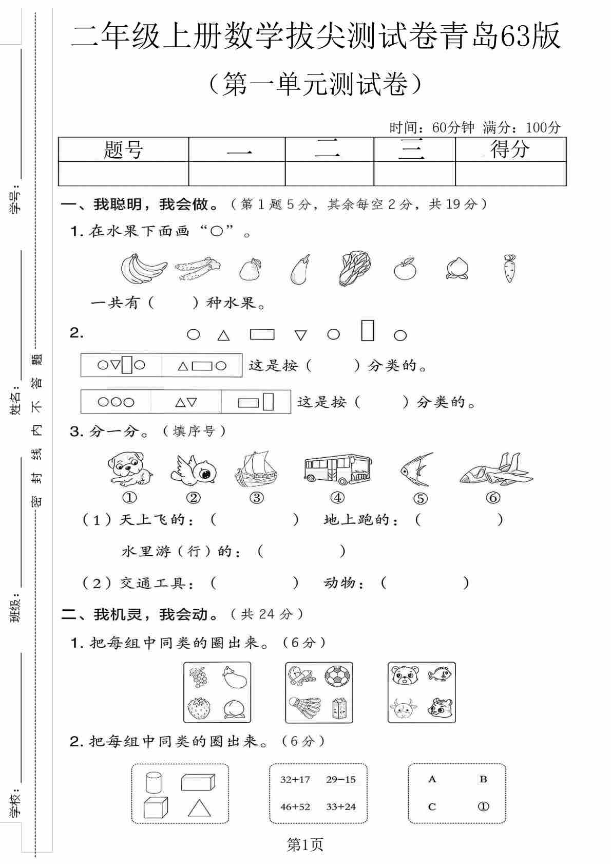 第一单元 分类(一)(单元测试•提升卷)数学青岛版二年级上册(解析版)