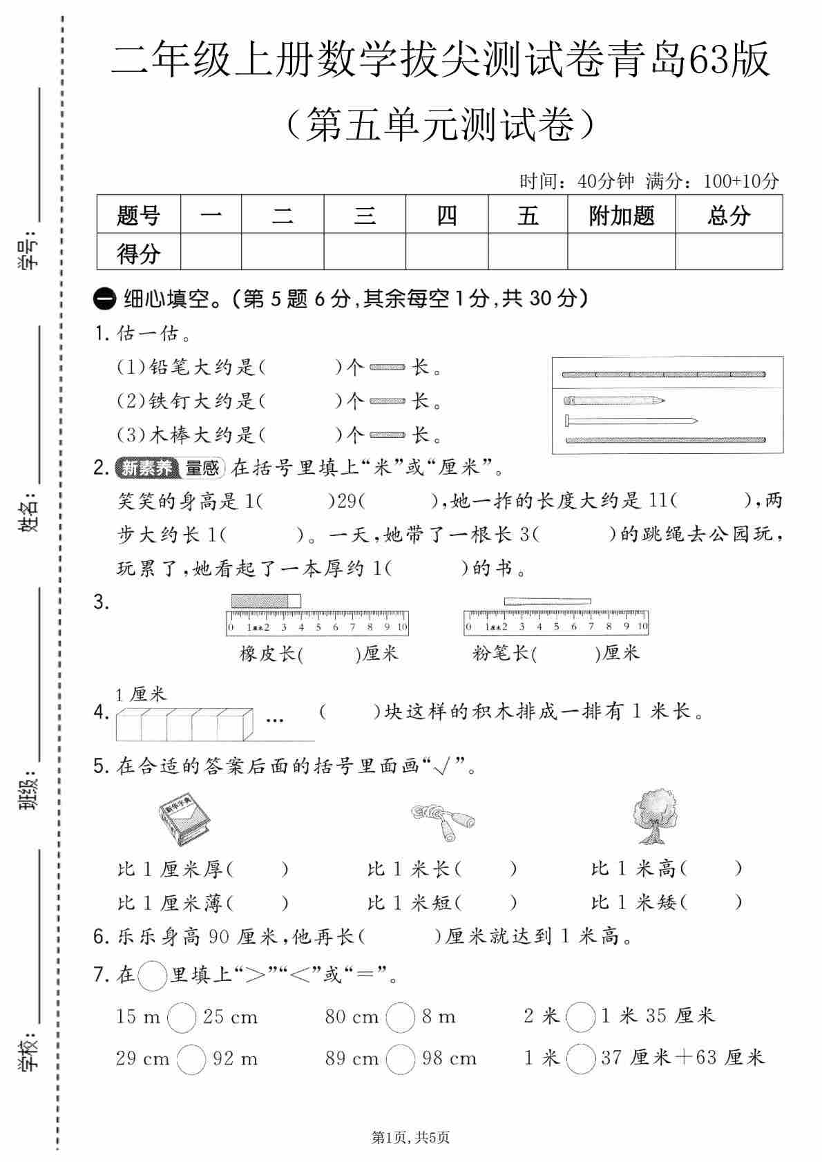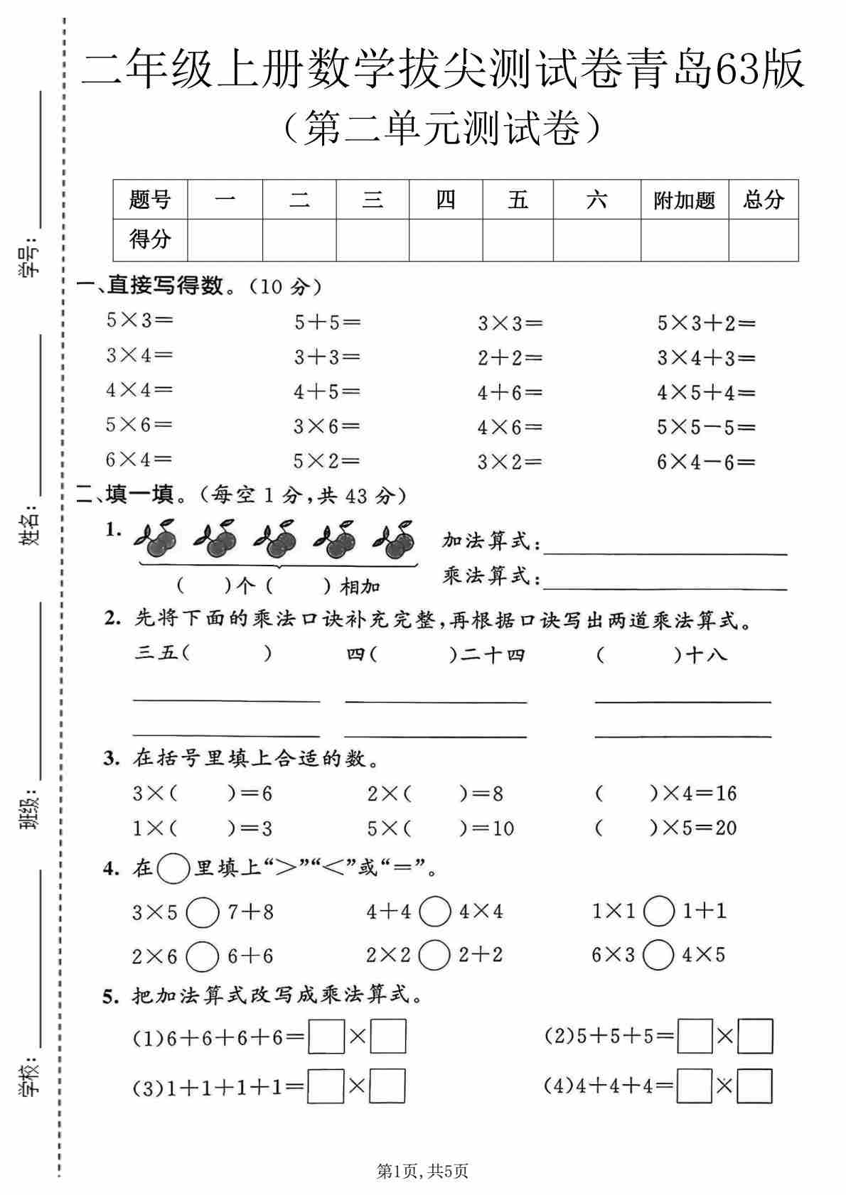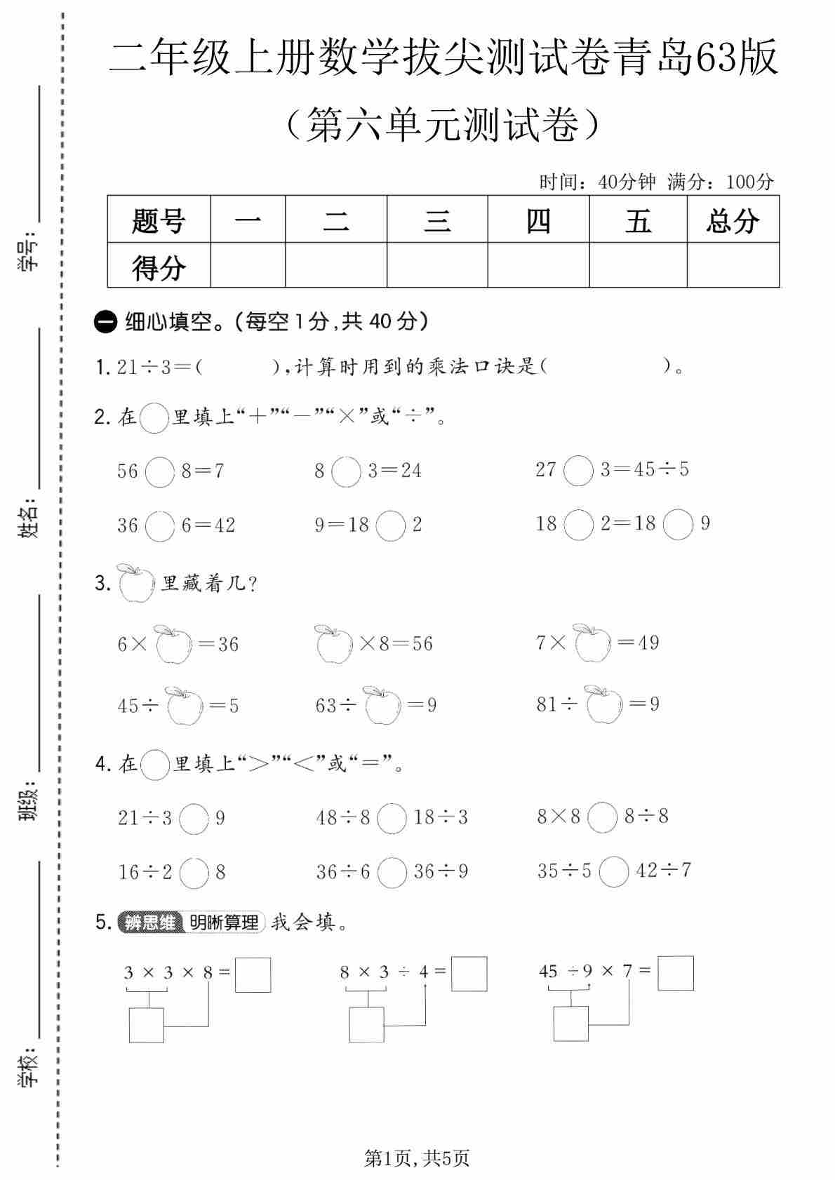 二年级(上)数学 第五单元质量检测卷《青岛63版》