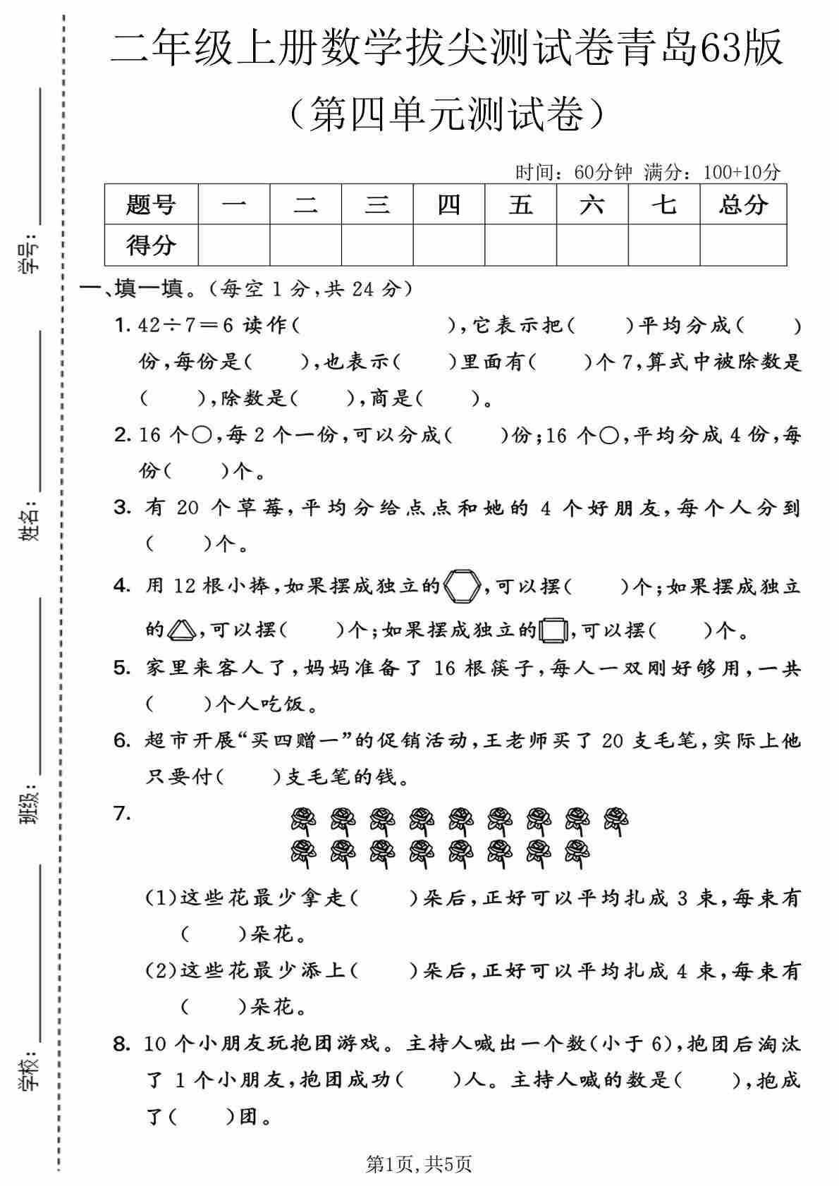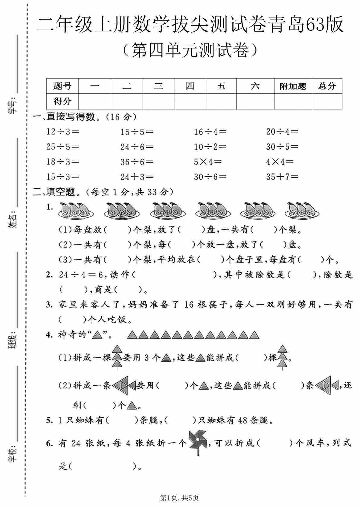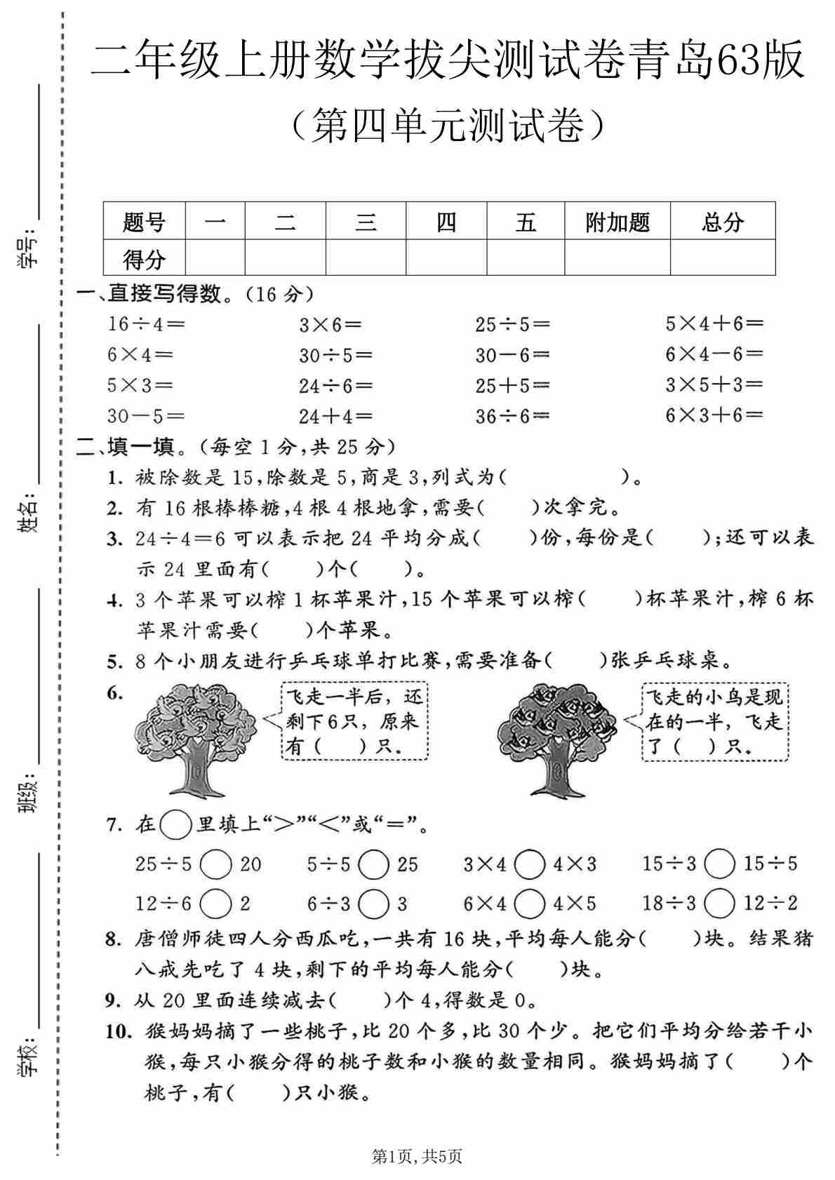 第四单元 除法的初步认识(单元测试•提升卷)数学青岛版二年级上册(A4版)