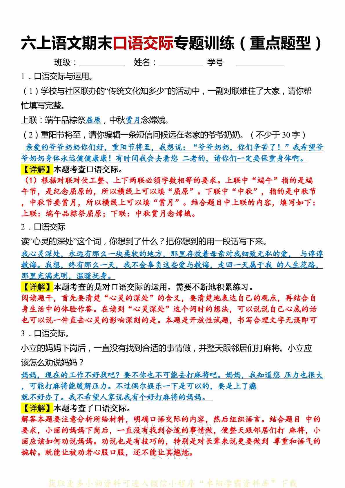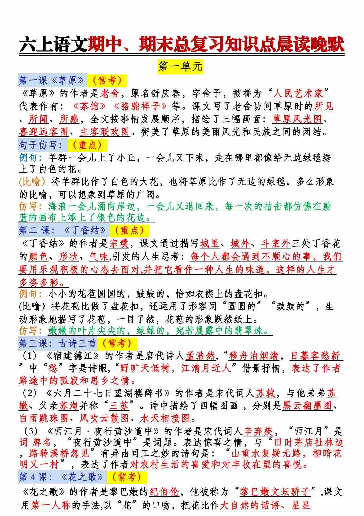 六上语文【期末专项复习(字词,句子,课文内容,课外阅读)】