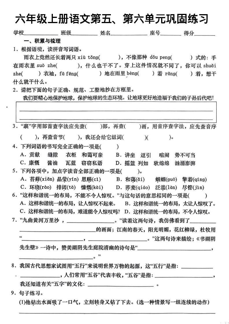 六上语文【《看拼音写字词》闯关训练,考查1-4单元(7页)】