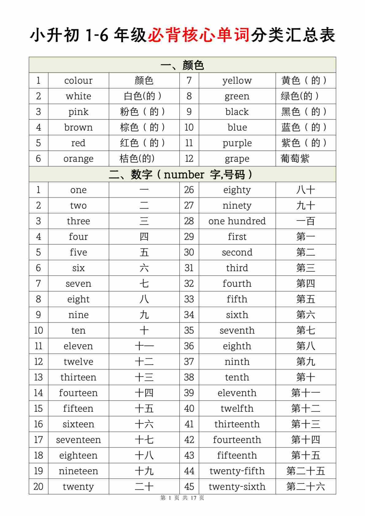 小升初英语【1-6年级必背核心单词分类汇总表】