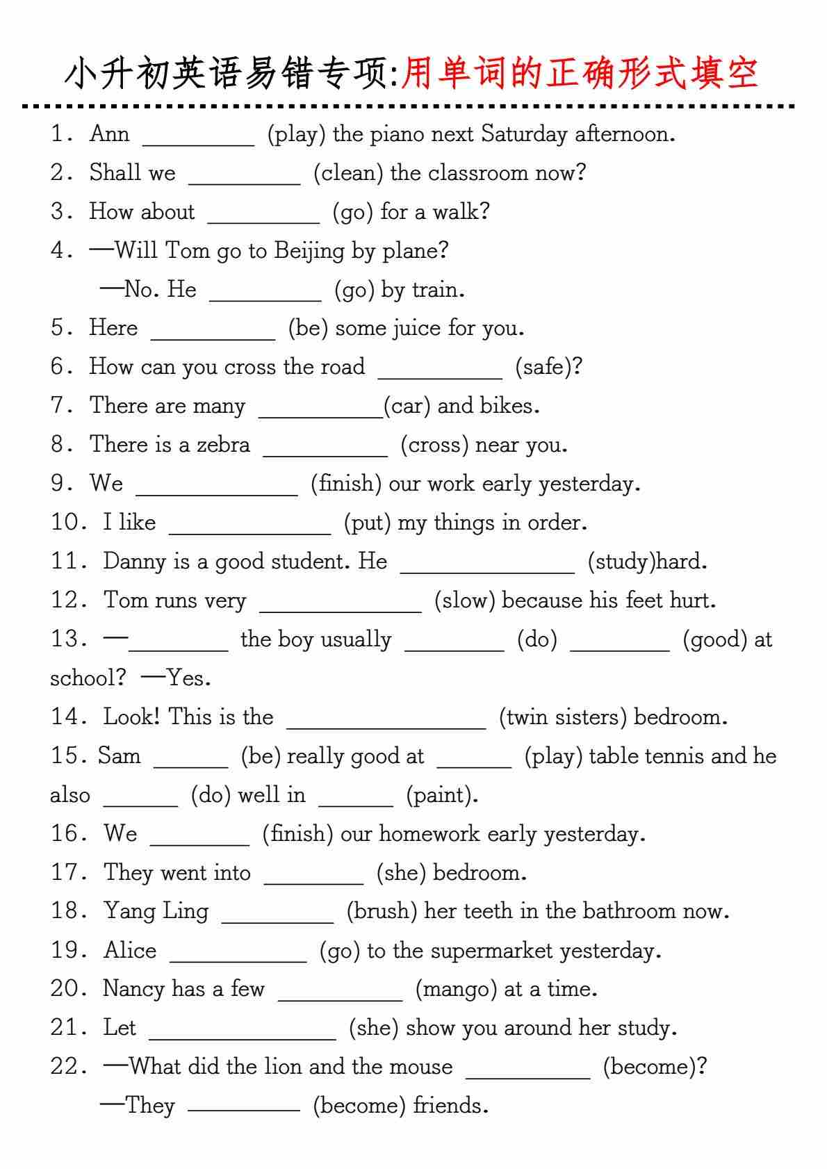 小升初英语【易错专项特训:用单词的正确形式填空】