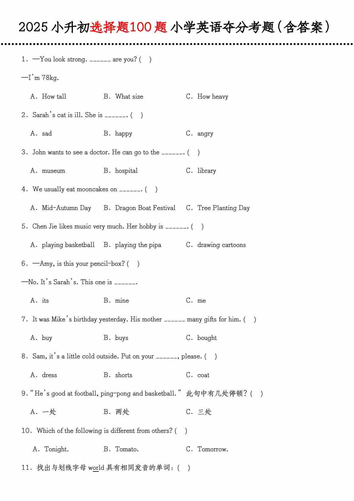 小升初英语【选择题 100题 夺分考题(含答案)】
