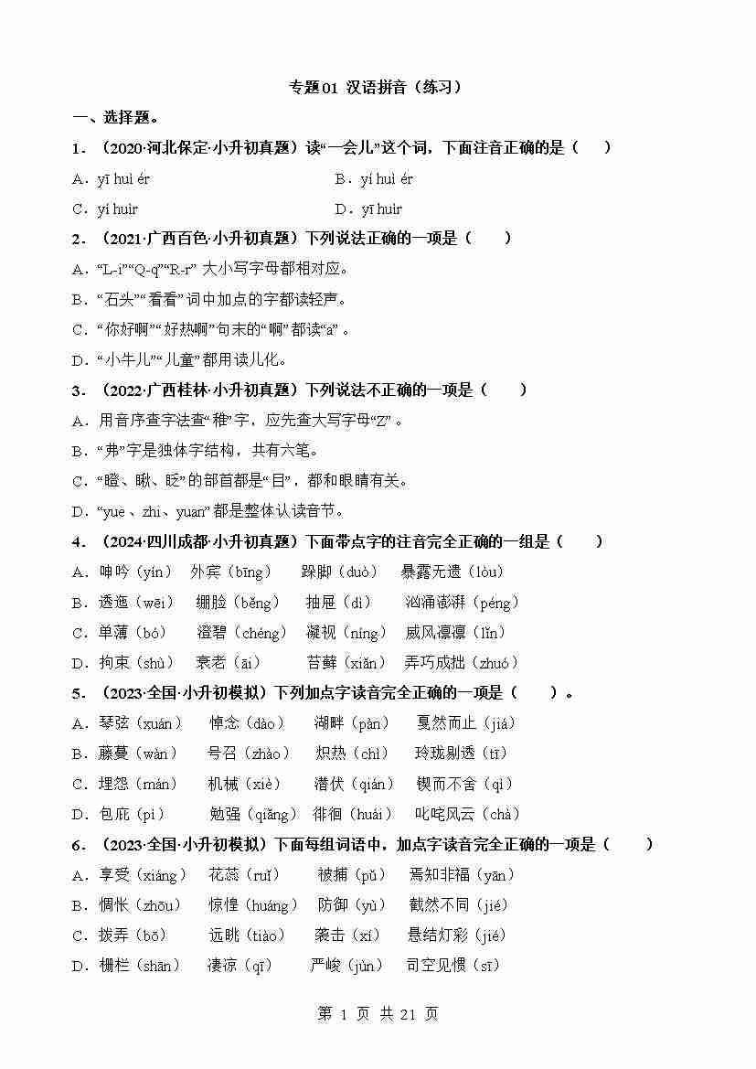 专题01 汉语拼音(练习)