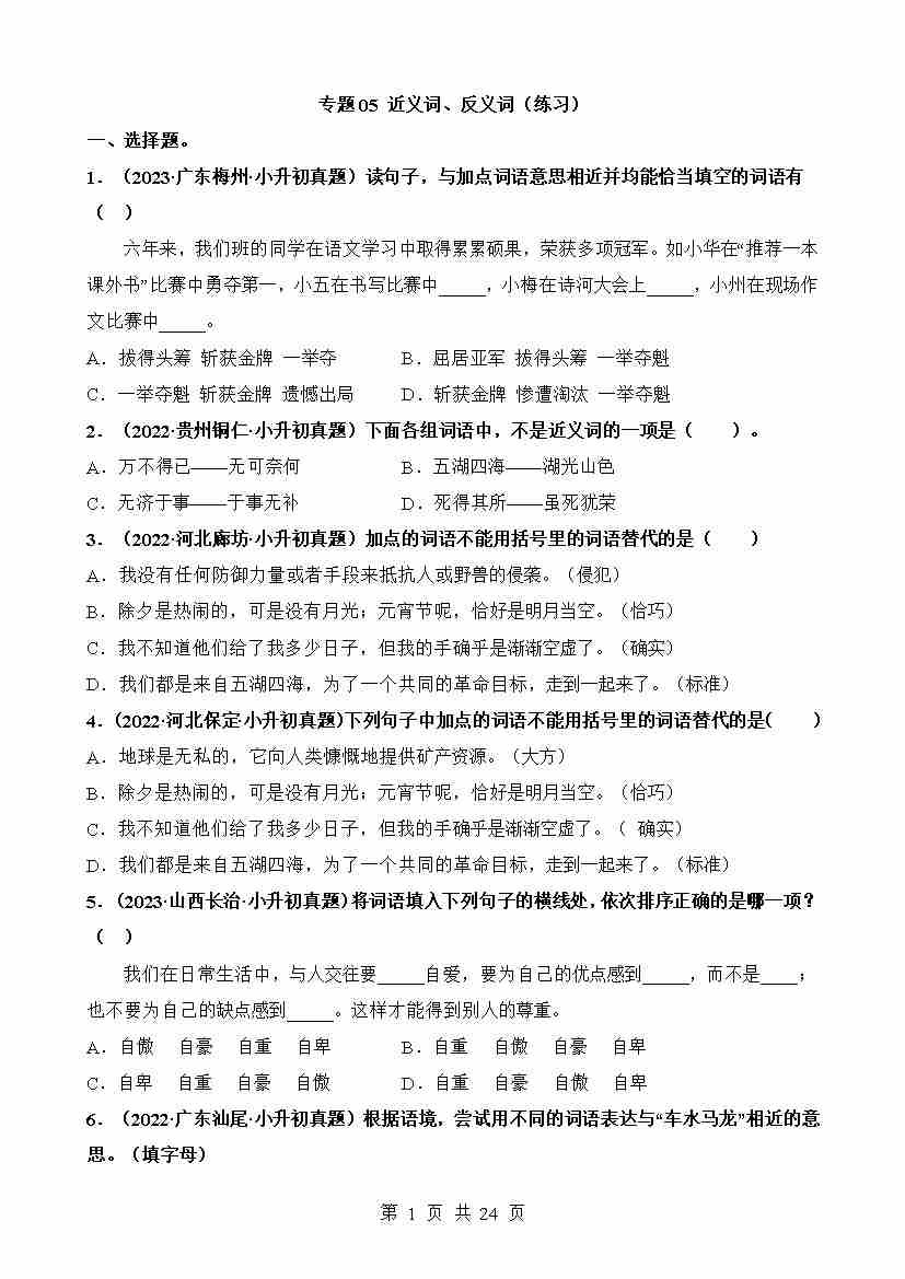 专题05 近义词、反义词(练习)