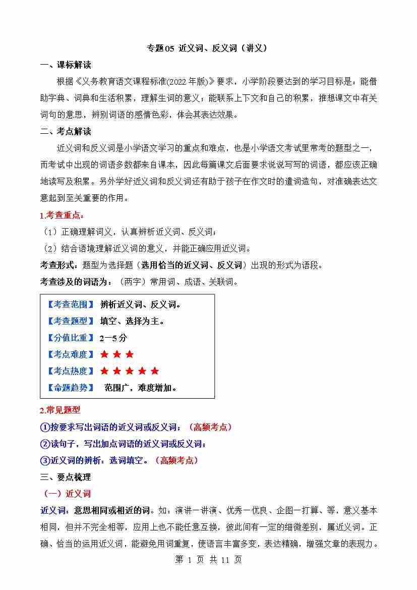 专题05 近义词、反义词(讲义)