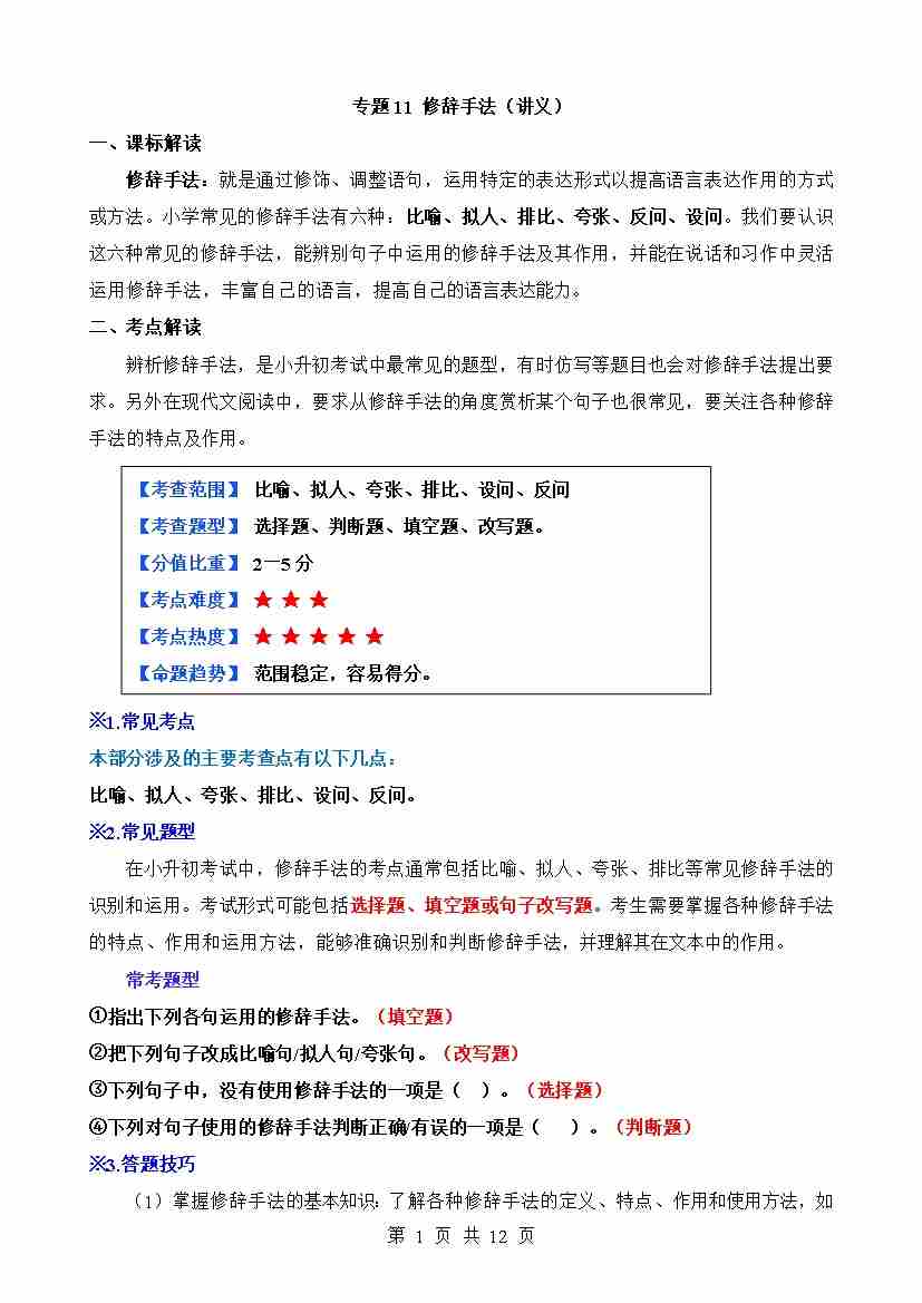 专题11 修辞手法(讲义)