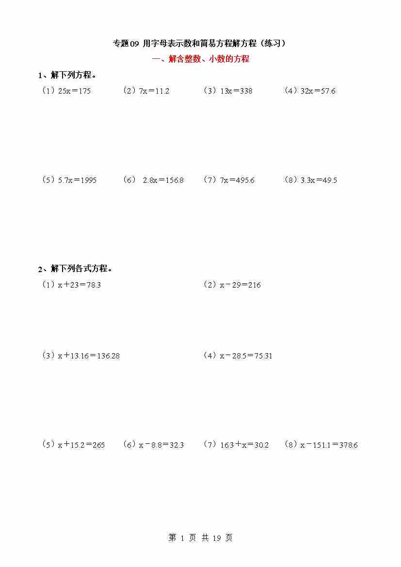专题09 用字母表示数和简易方程解方程(练习)