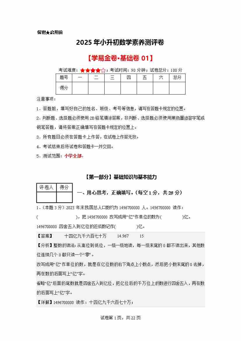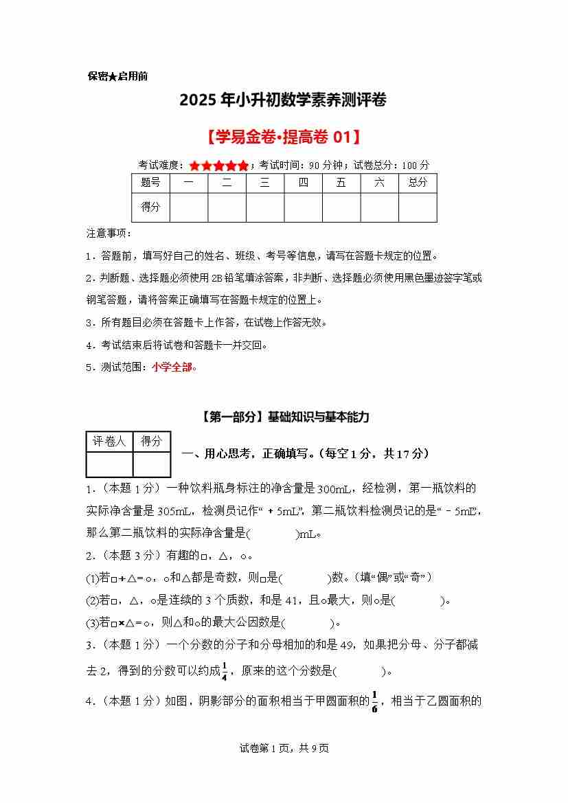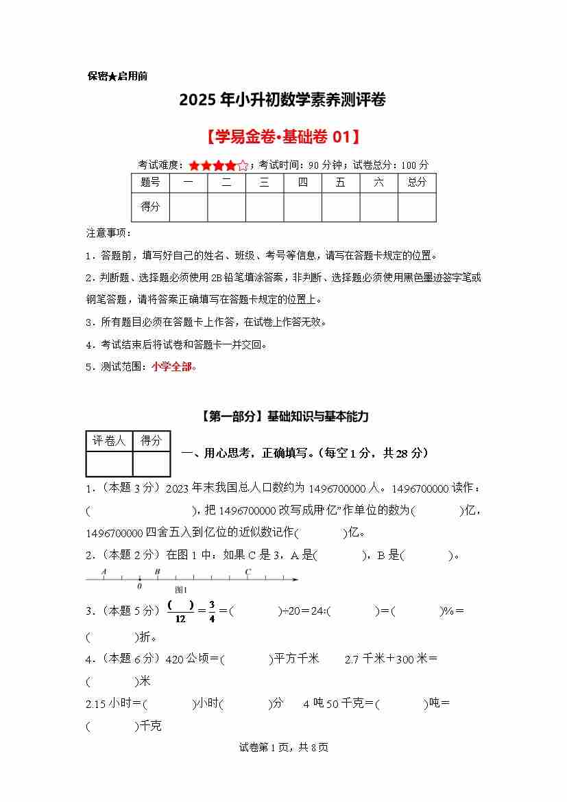 【A4考试版】数学(基础卷01)2025年小升初全真模拟(人教版)