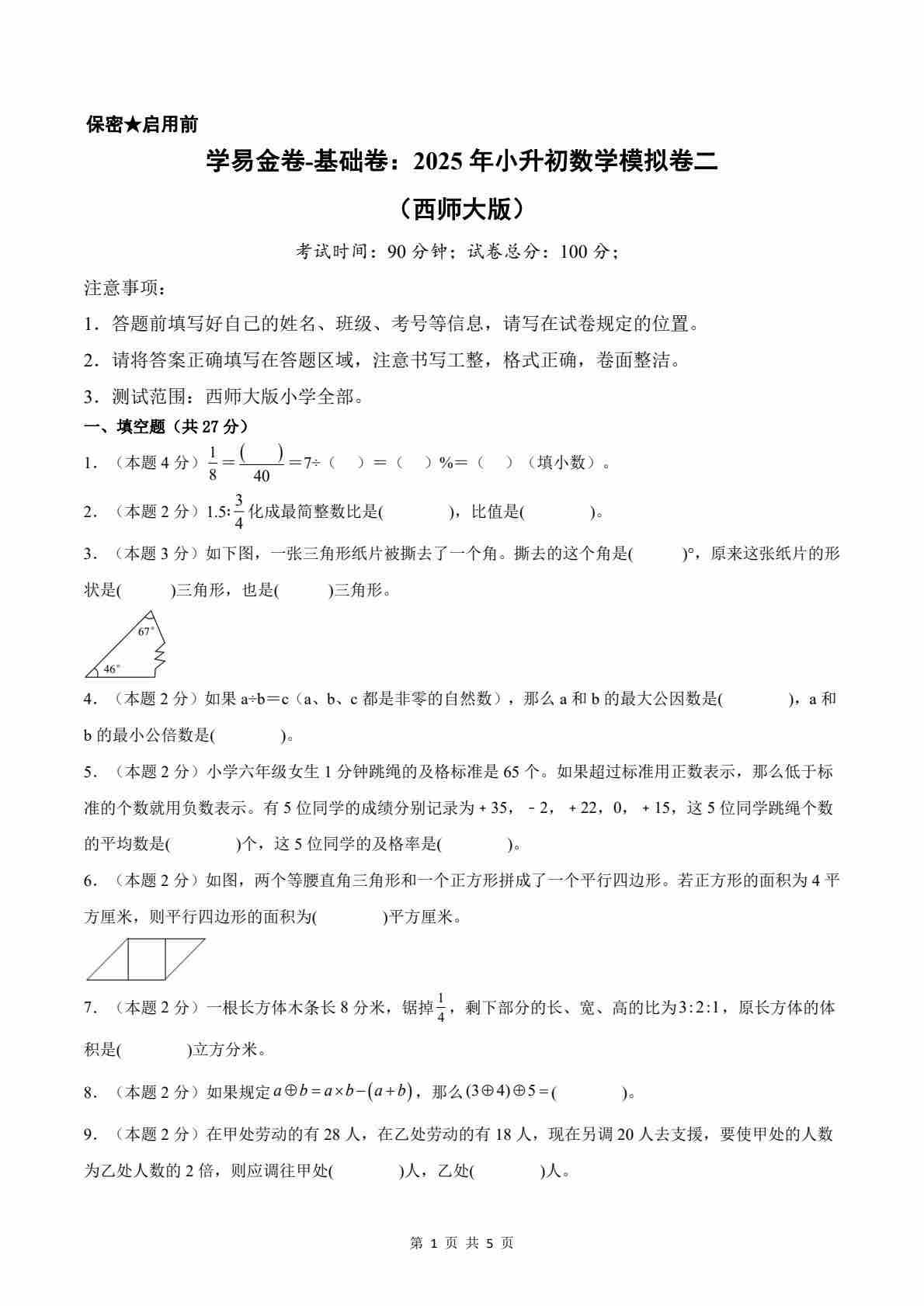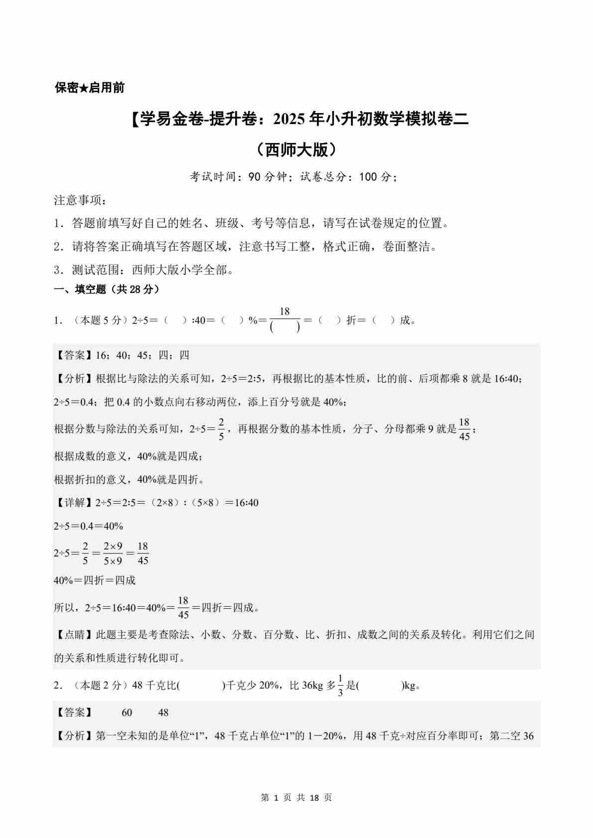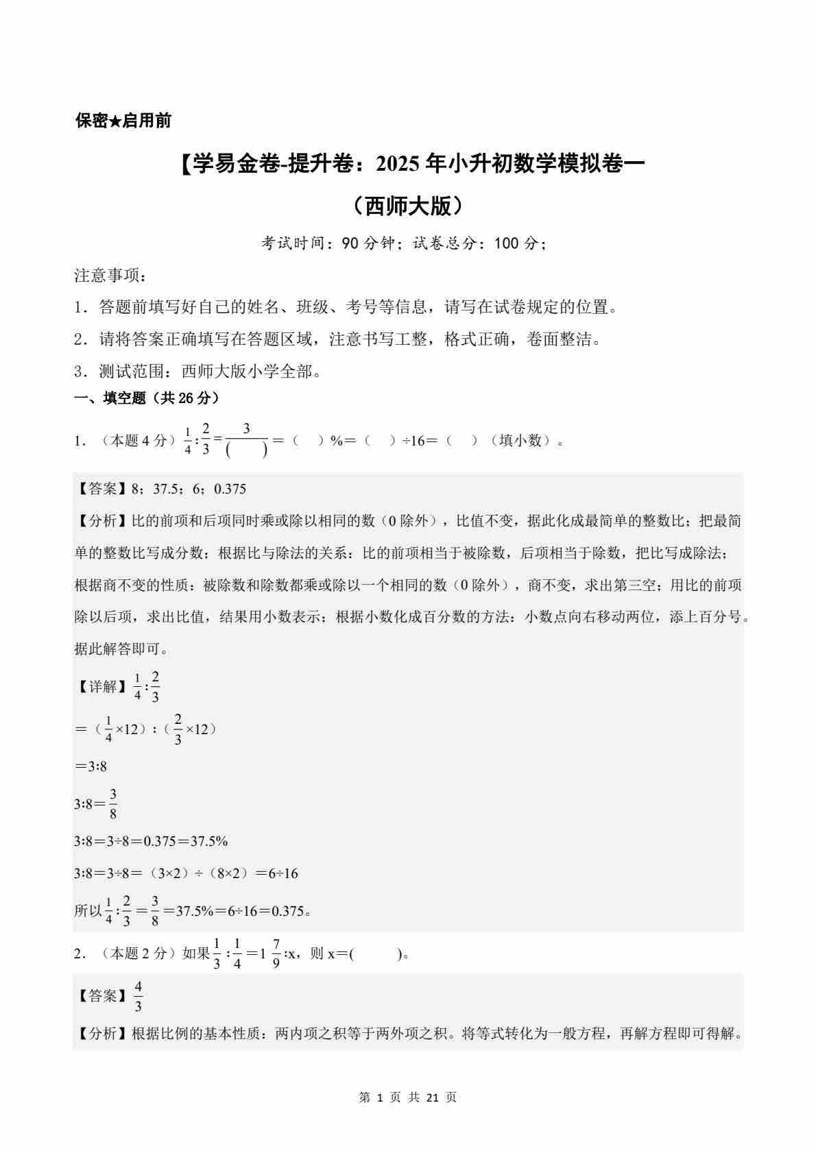 【西师大版】数学(提升卷02)(考试A4版)