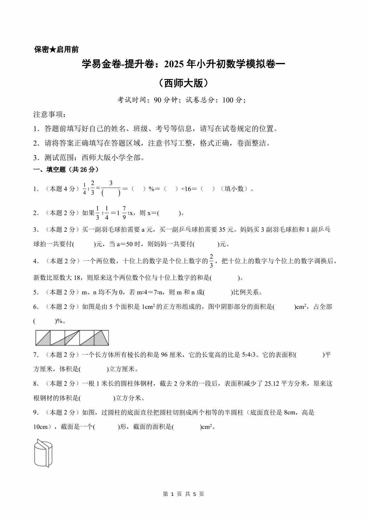 【西师大版】数学(提升卷01)(考试A4版)