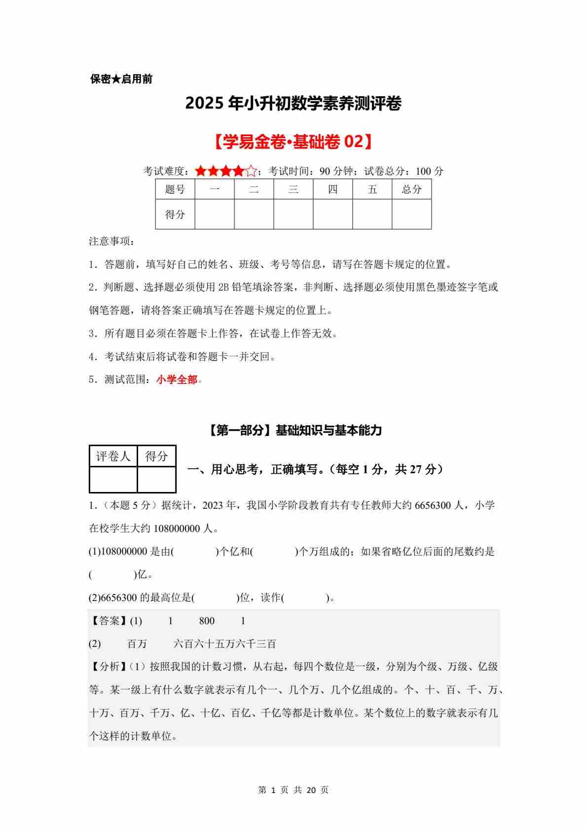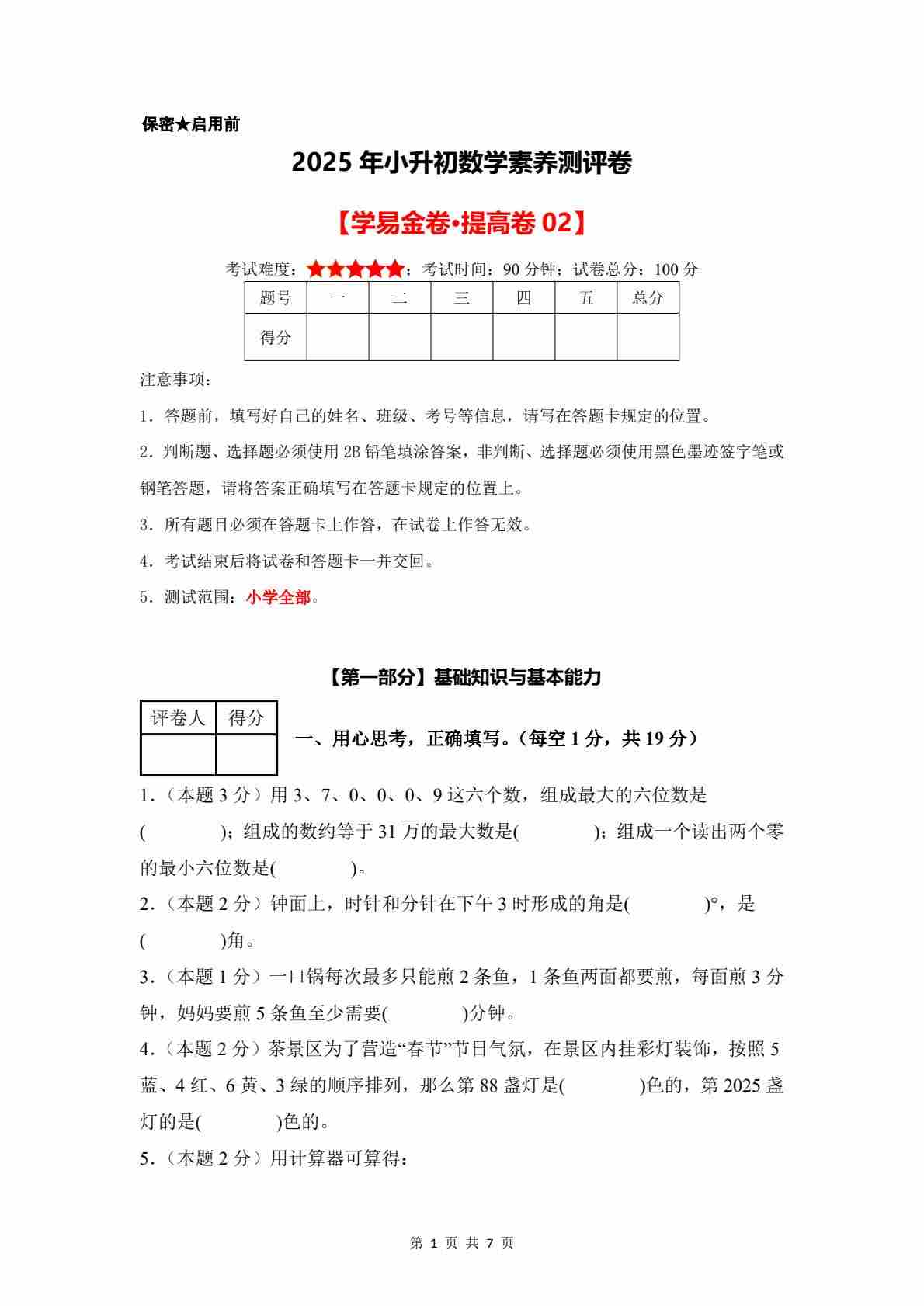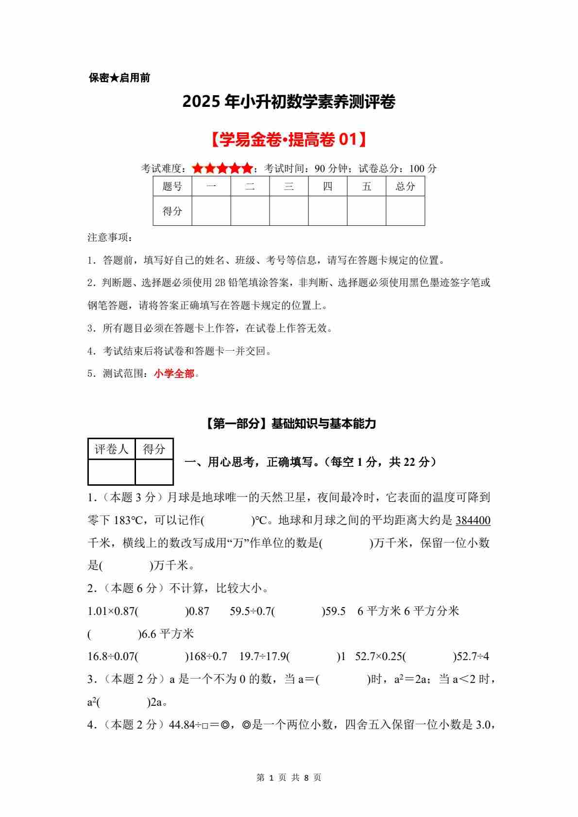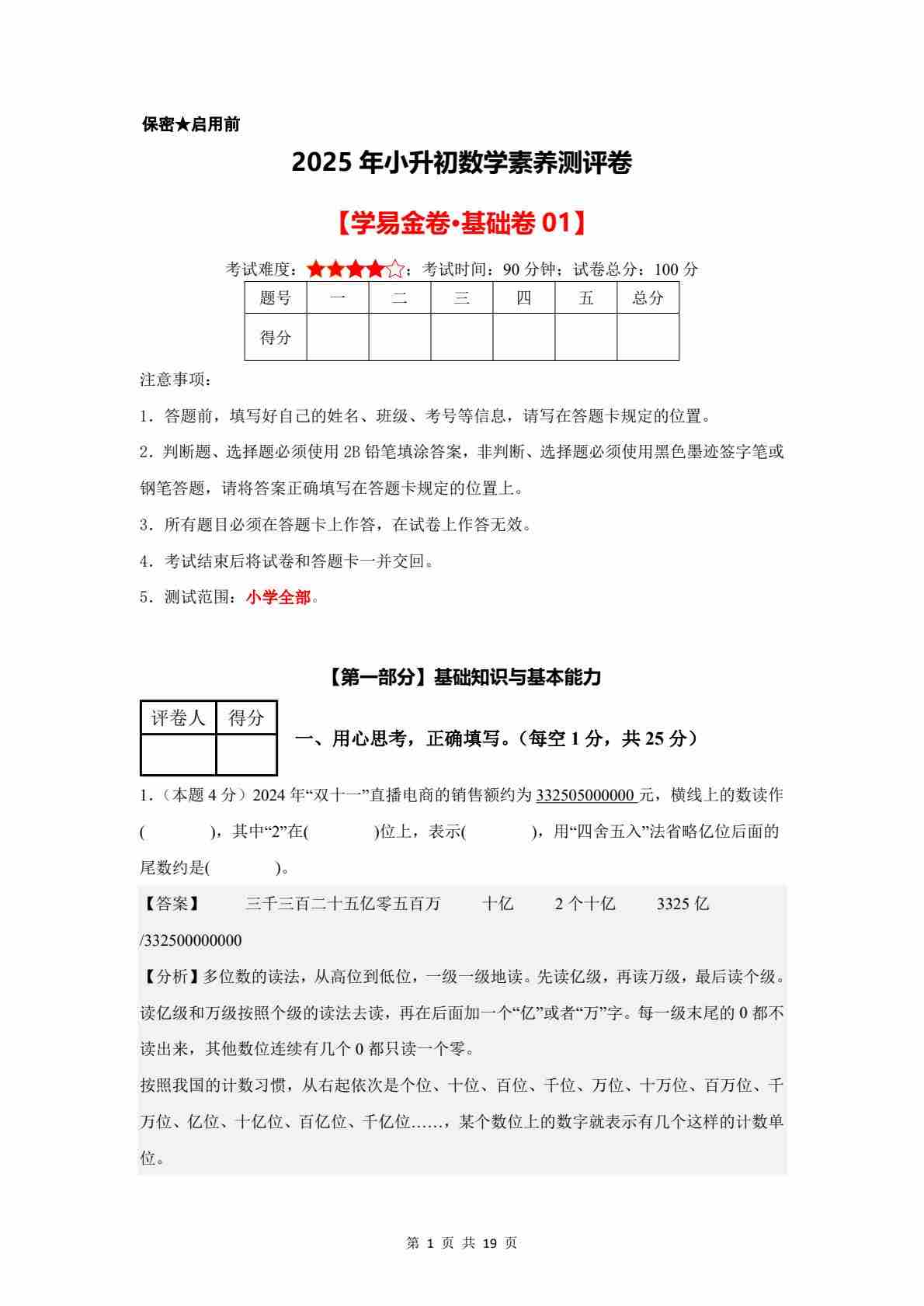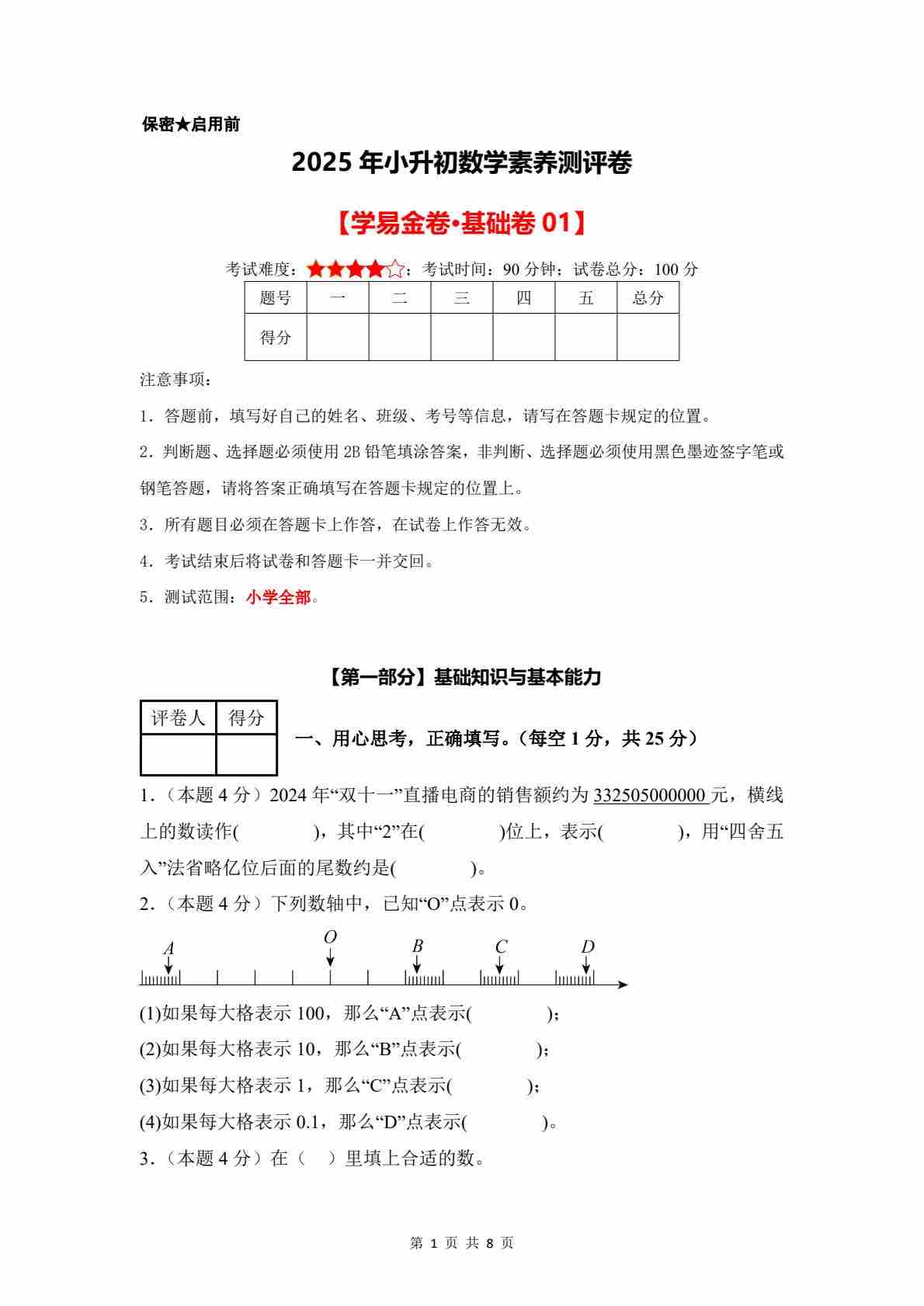 数学(基础卷01)2025年小升初【A4考试版】(沪教版)