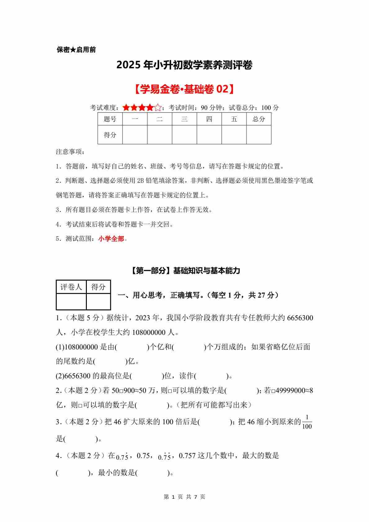 数学(基础卷02)2025年小升初【A4考试版】(沪教版)