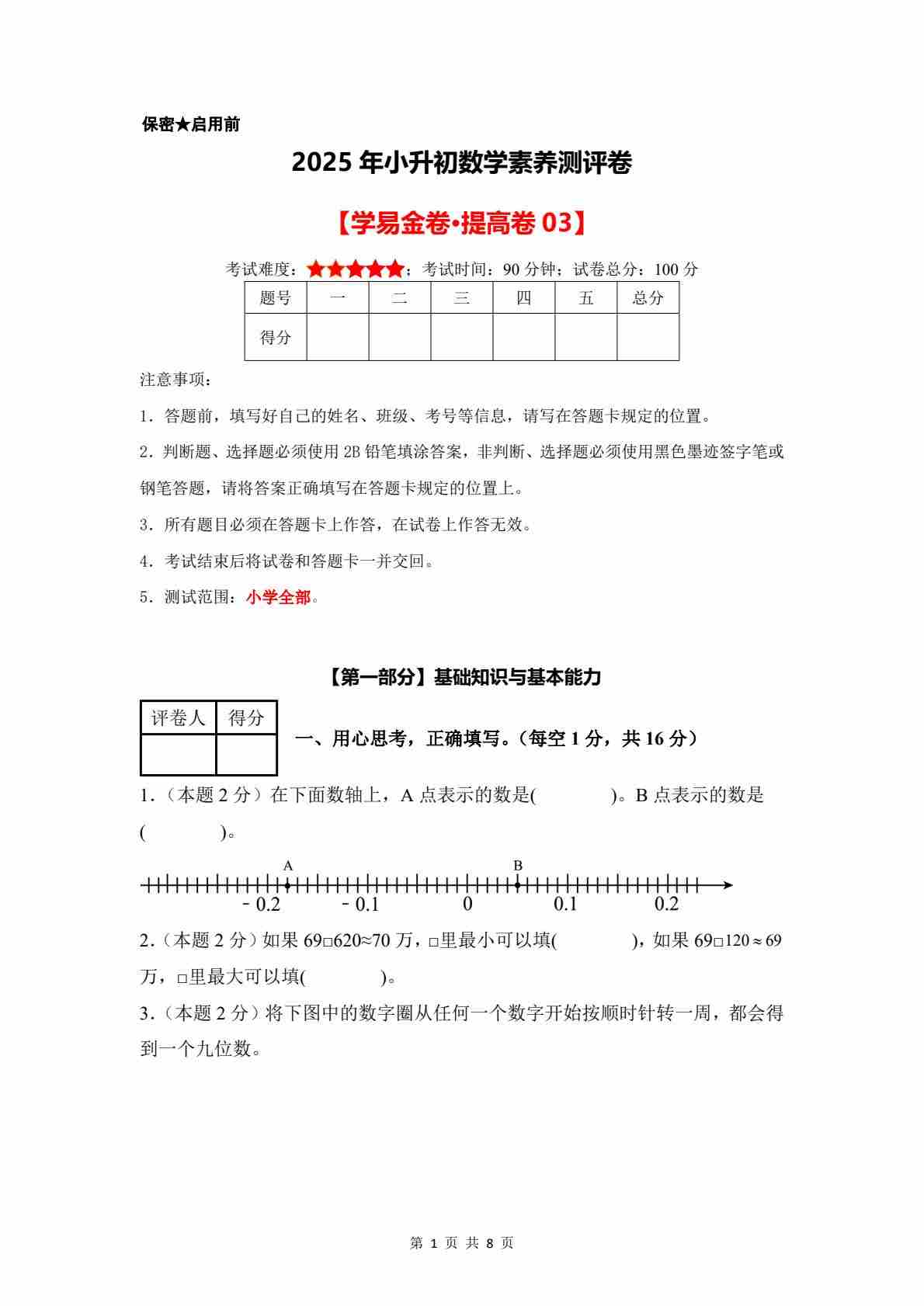 数学(提高卷03)2025年小升初【A4考试版】(沪教版)