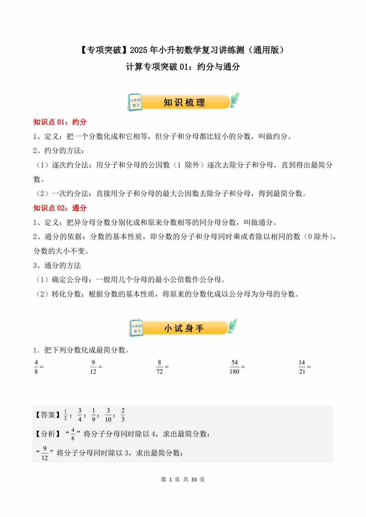 计算专项突破01:约分与通分-2025年小升初数学复习讲练测(通用版)(学生版)77