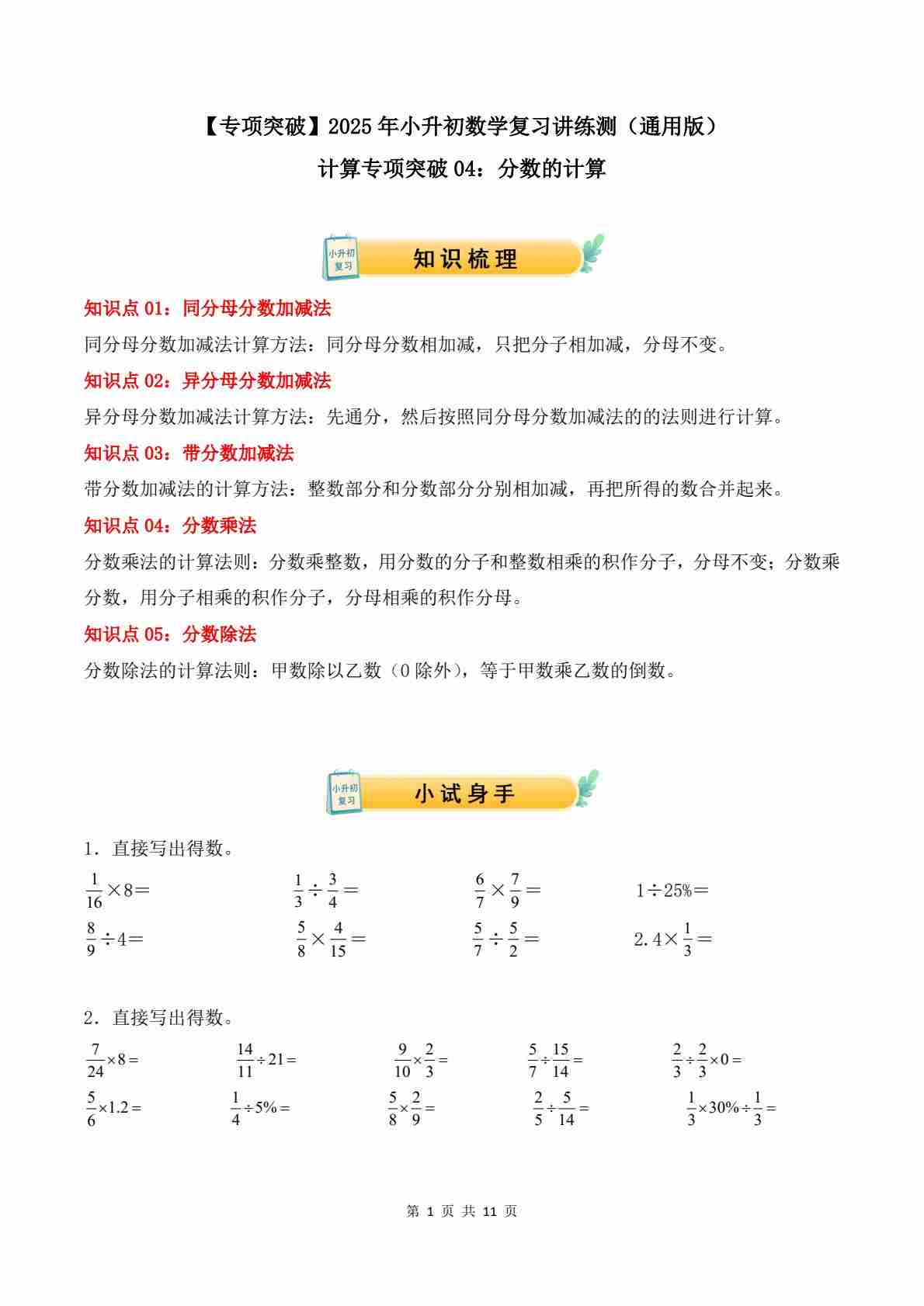 计算专项突破04:分数的计算-2025年小升初数学复习讲练测(通用版)(学生版)