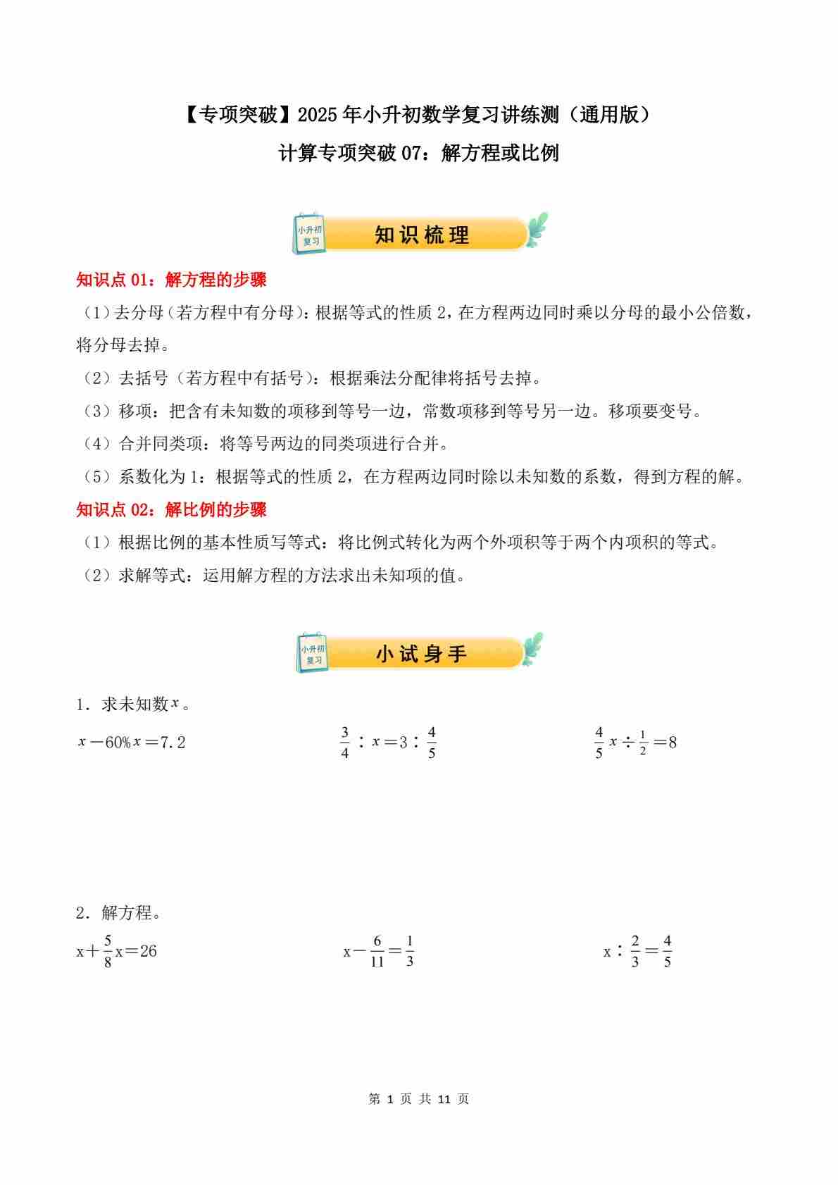 计算专项突破07:解方程或比例-2025年小升初数学复习讲练测(通用版)(学生版)